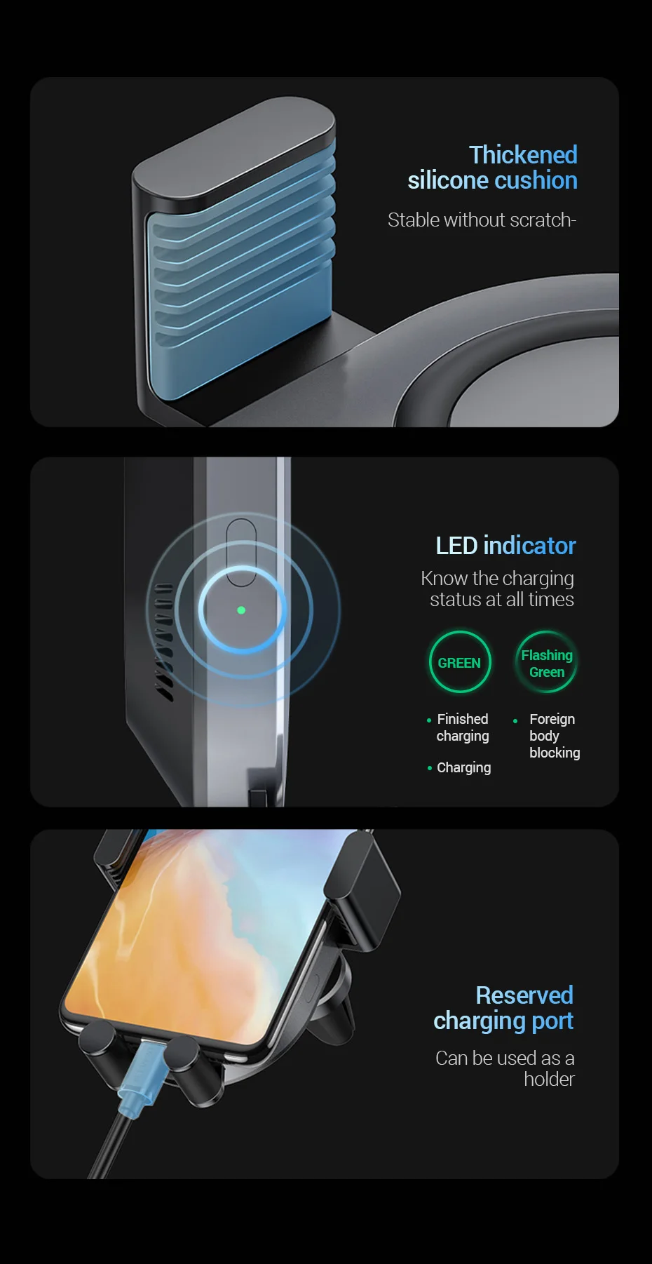 • Brazos de detección y abrazadera automática • Carga de velocidad máxima de 15W,