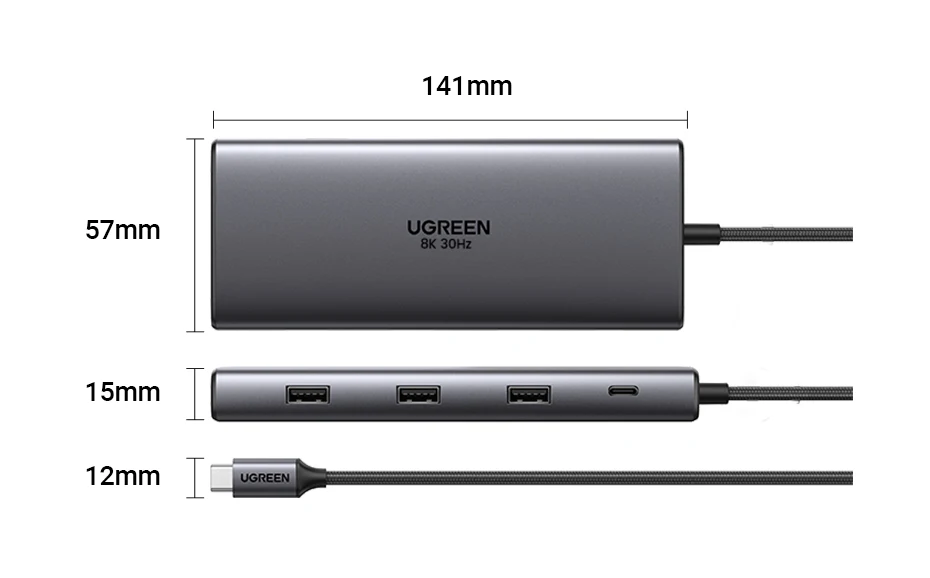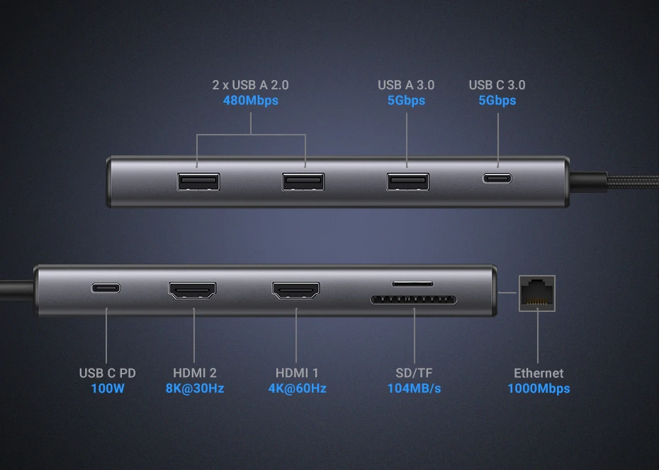 1*8K@30Hz HDMI2 + 1*4K@60Hz HDMI1 + 1*1000Mbps RJ45 + 1*100W PD + 1*104MB/s.SD/TF + 1*USB-A 3.0 + 1*USB-C 3.0 + 2*USB-A 2.0