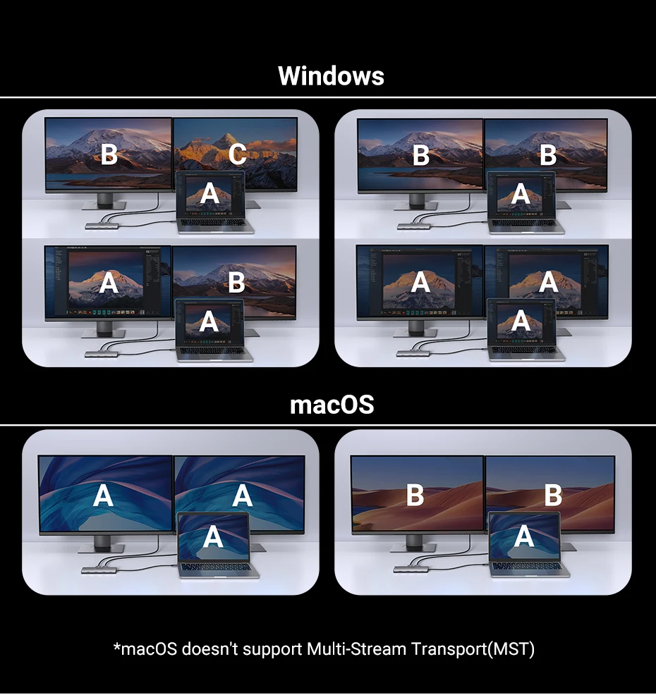 A4:Cuando Mac está conectado a dispositivos de monitor dual, la estación de acoplamiento solo admite la extensión de una pantalla, y otra pantalla solo puede copiar la pantalla que extendió, lo que significa que solo admite AAA o ABB.