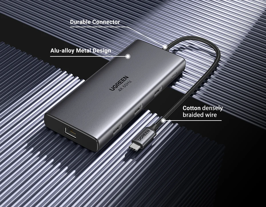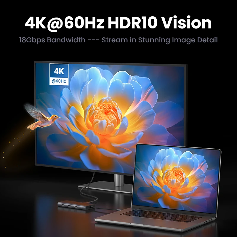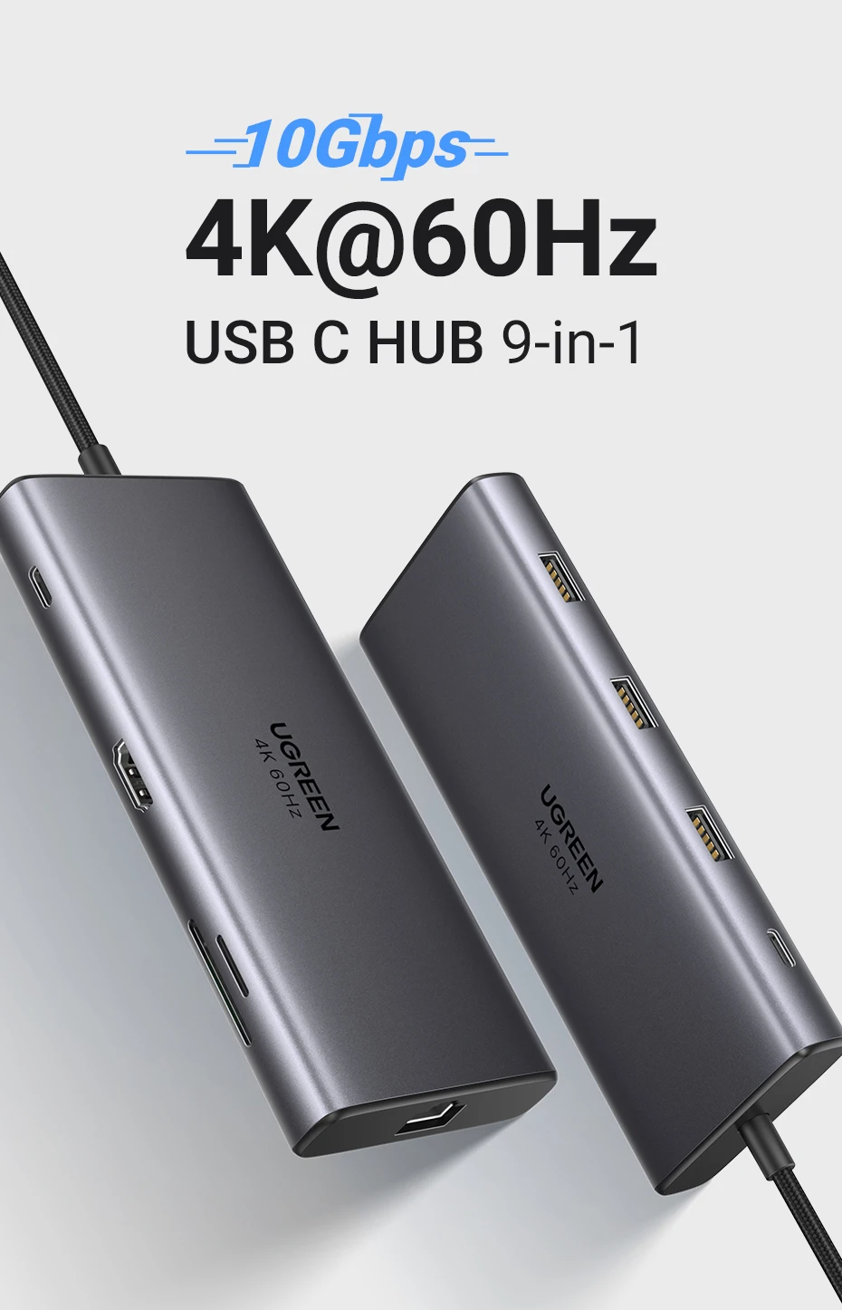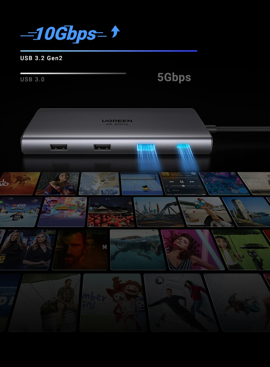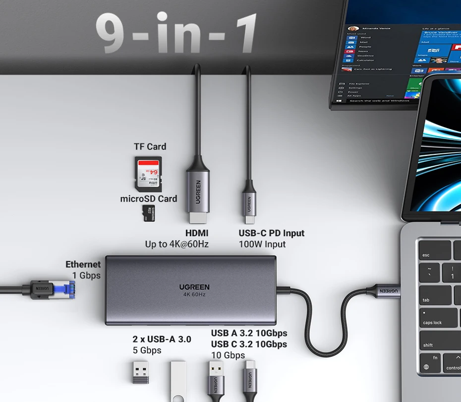 1x USB-C 3.2 10Gbps + 1x USB-A 3.2 10Gbps + 4K@60Hz HDMI + 1000Mbps RJ45 + PD100W + 104MB/s. SD/TF + 2*USB3.0 5Gbps