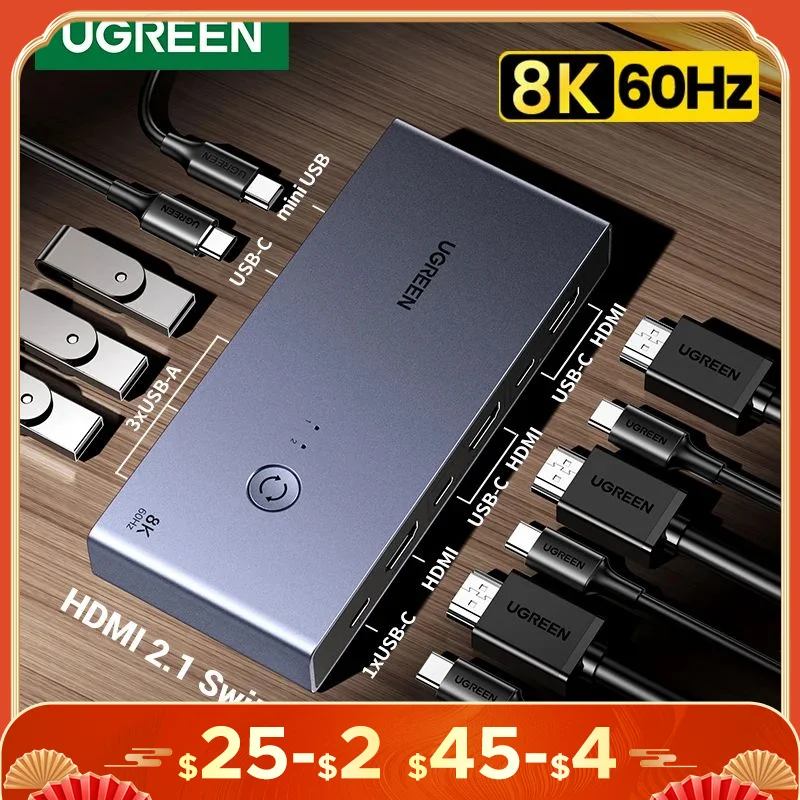 Comprar UGREEN-conmutador KVM 8K 60Hz HDMI, USB C, USB 3,0, 2 piezas, compartir 1 Monitor, impresora, teclado, ratón, 3D ,HDR Vision
