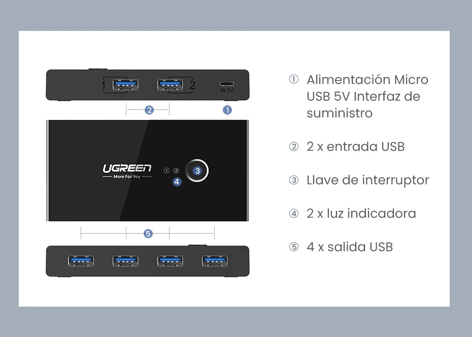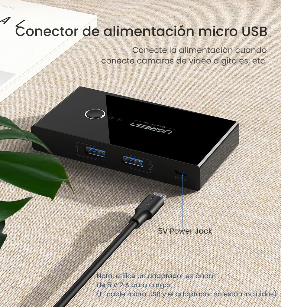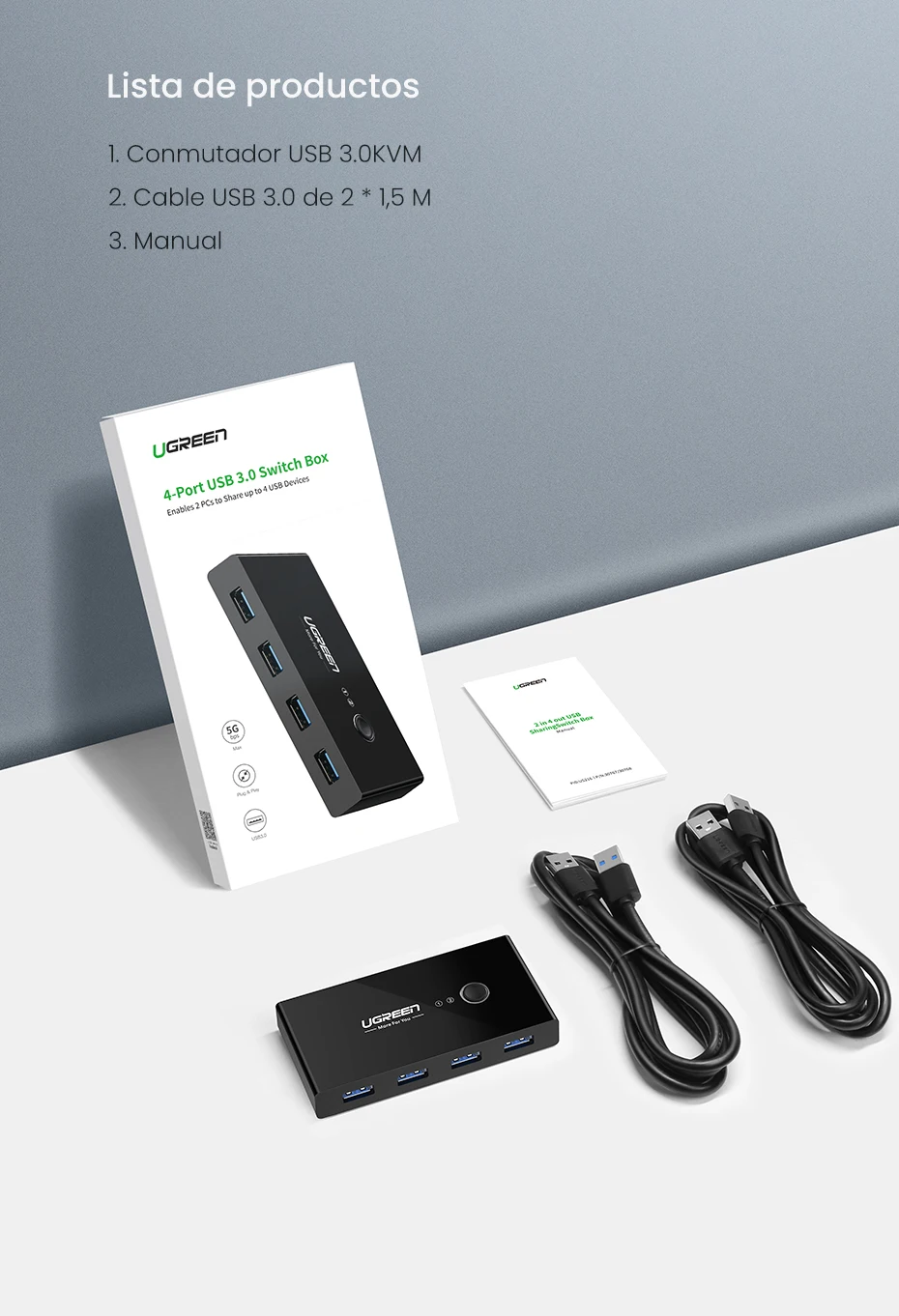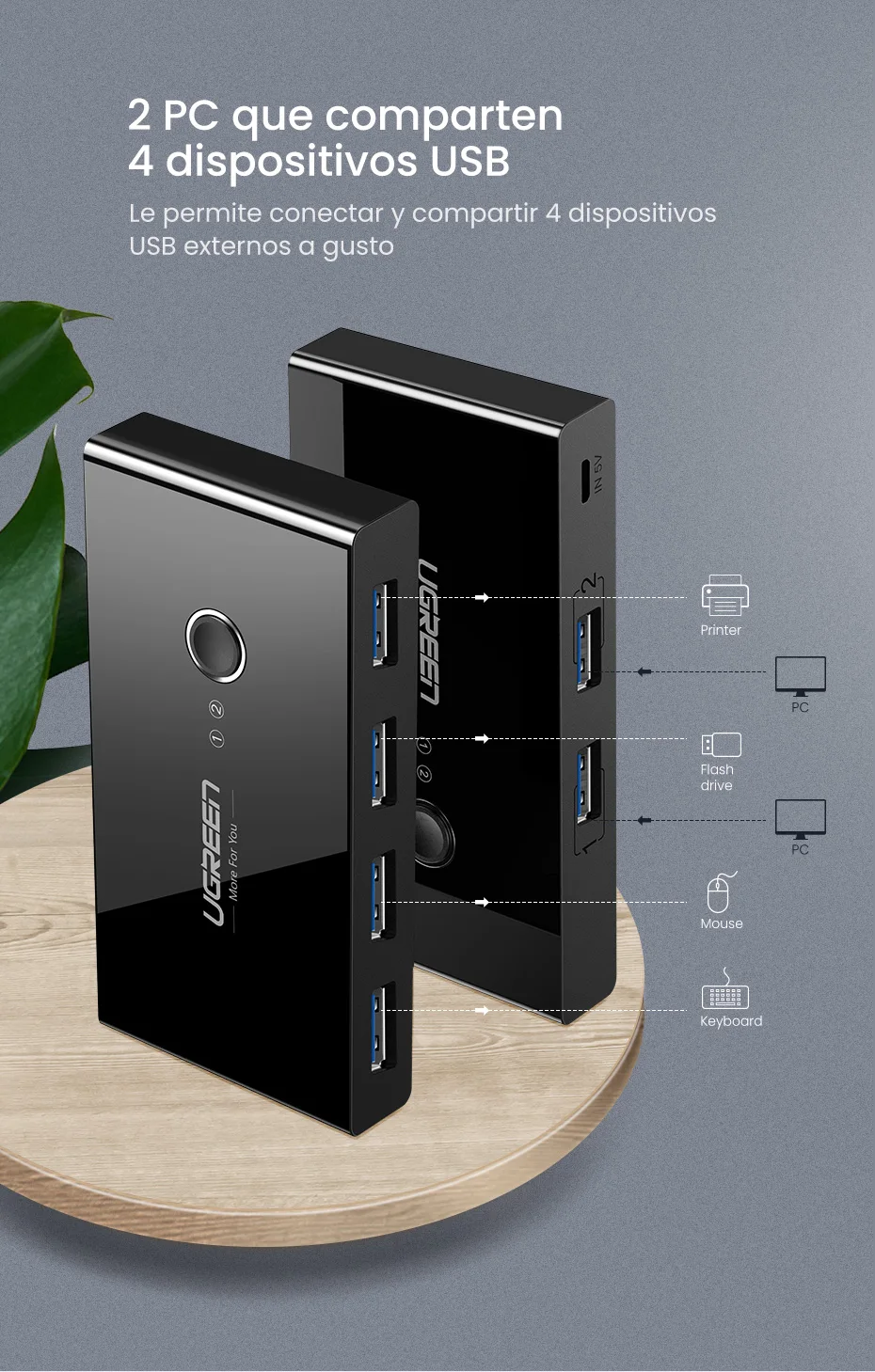 Visión general:UGREEN USB 3.0 / 2.0 KVM Switch 2-a-4 es una excelente opción para compartir 4 dispositivos USB entre dos sistemas, es ideal para compartir una impresora o escáner en un entorno de oficina pequeña. También es ideal para usar en casa si tiene varias PC o Mac.Atención por favor:1) Hay modelos USB 3.0 / USB 2.0 opcionales, realice el pedido de acuerdo con sus necesidades reales.2) Utilice un adaptador de corriente USB estándar DC 5V 2A (el adaptador de corriente y el cable micro USB no están incluidos en el paquete, tenga en cuenta). NO se permite ningún cargador con salida de mayor voltaje y puede afectar el rendimiento del producto.3) Los dispositivos inalámbricos de 2.4Ghz, como wifi, adaptadores inalámbricos de teclado y mouse, pueden no funcionar de manera estable cerca de dispositivos o concentradores USB 3.0. Intente usar el puerto host o una conexión USB 2.0.