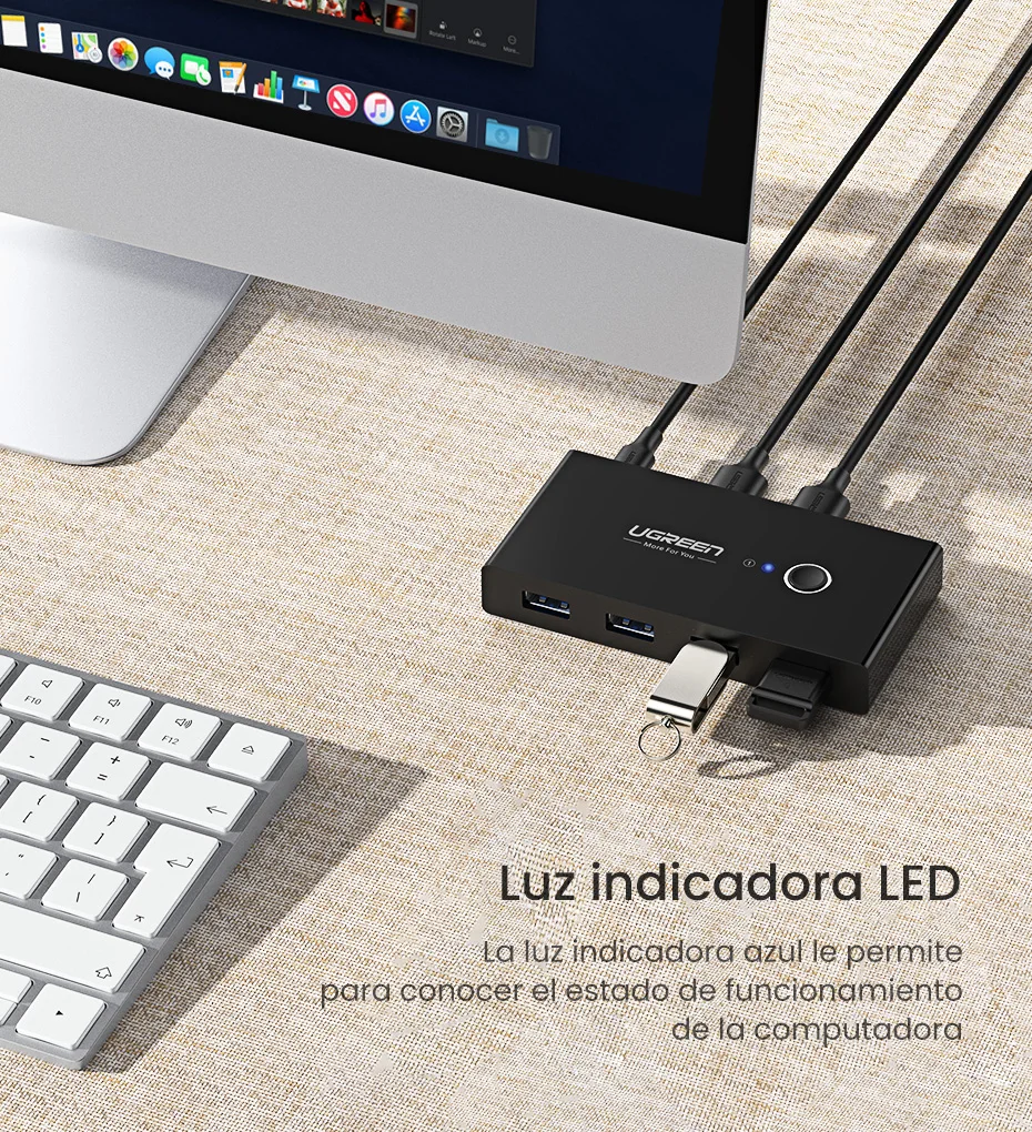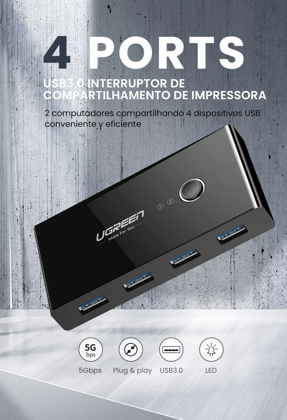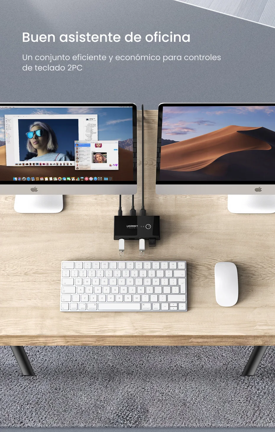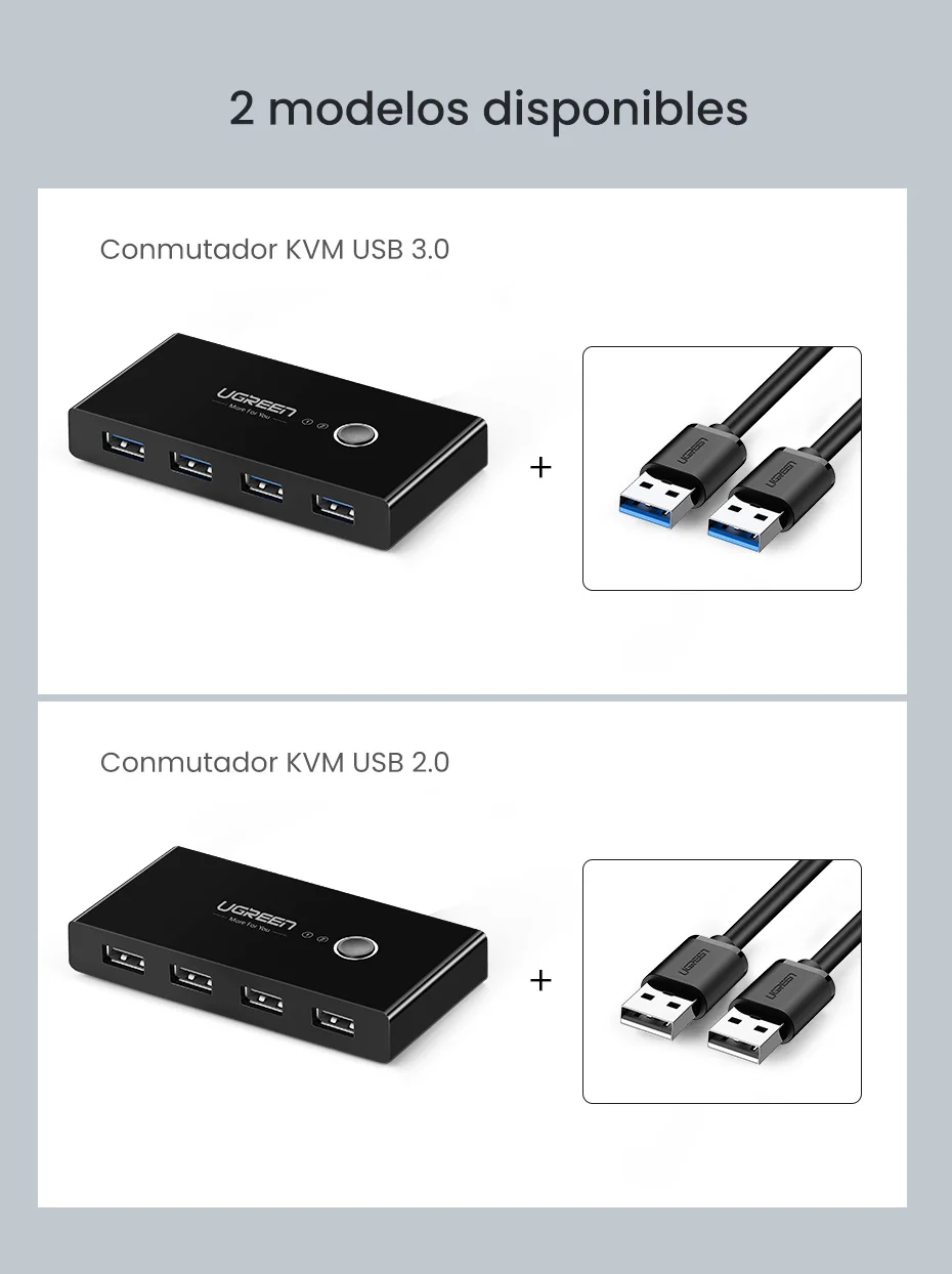 Visión general:UGREEN USB 3.0 / 2.0 KVM Switch 2-a-4 es una excelente opción para compartir 4 dispositivos USB entre dos sistemas, es ideal para compartir una impresora o escáner en un entorno de oficina pequeña. También es ideal para usar en casa si tiene varias PC o Mac.Atención por favor:1) Hay modelos USB 3.0 / USB 2.0 opcionales, realice el pedido de acuerdo con sus necesidades reales.2) Utilice un adaptador de corriente USB estándar DC 5V 2A (el adaptador de corriente y el cable micro USB no están incluidos en el paquete, tenga en cuenta). NO se permite ningún cargador con salida de mayor voltaje y puede afectar el rendimiento del producto.3) Los dispositivos inalámbricos de 2.4Ghz, como wifi, adaptadores inalámbricos de teclado y mouse, pueden no funcionar de manera estable cerca de dispositivos o concentradores USB 3.0. Intente usar el puerto host o una conexión USB 2.0.