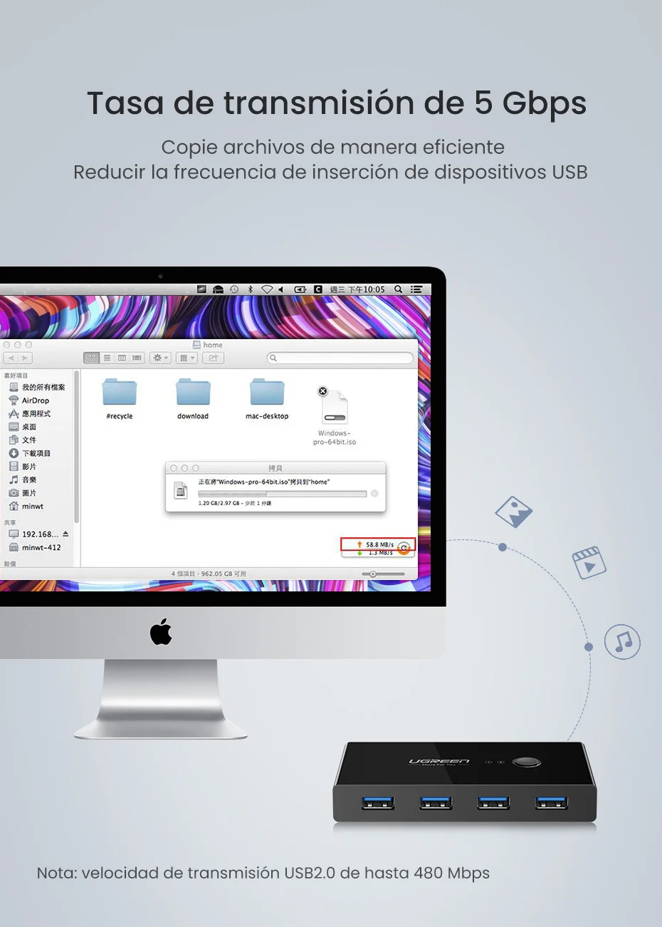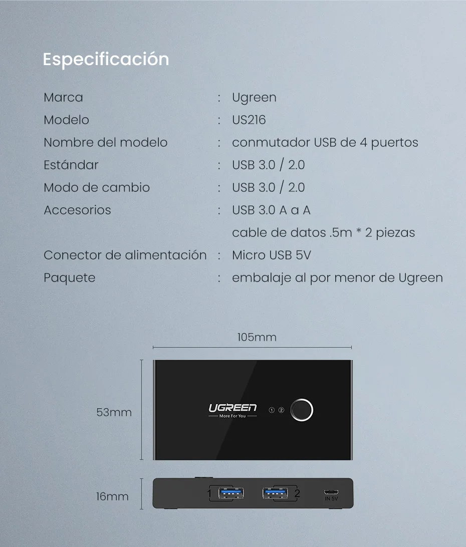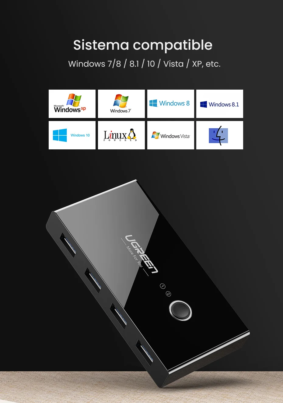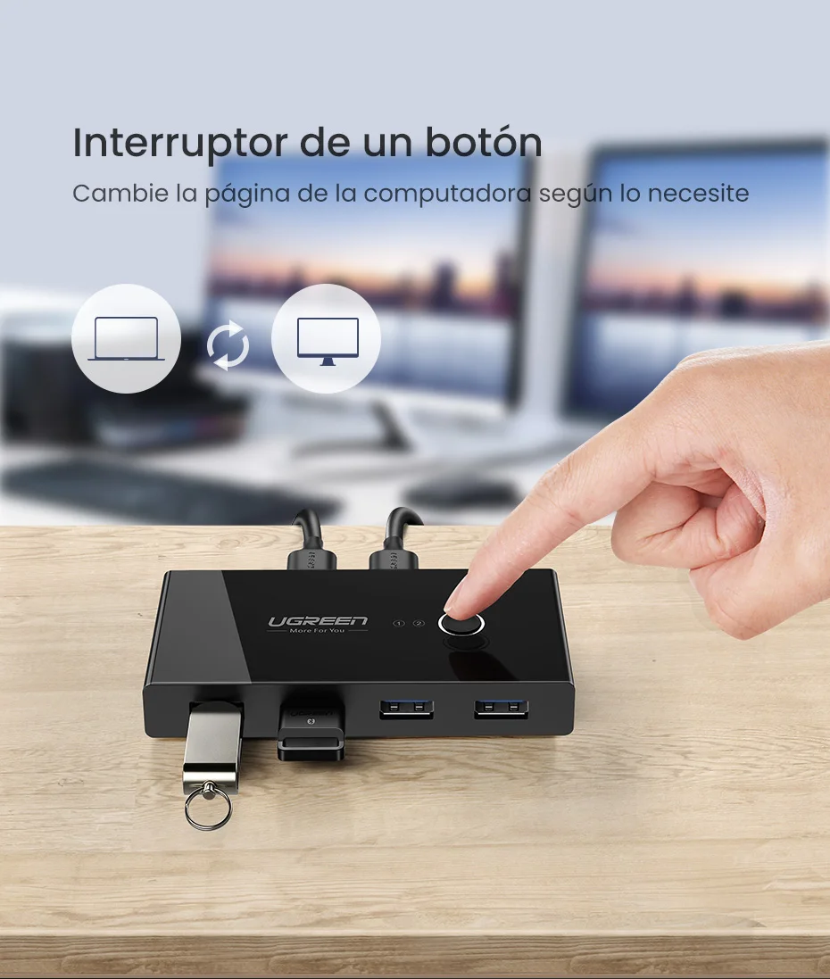 Visión general:UGREEN USB 3.0 / 2.0 KVM Switch 2-a-4 es una excelente opción para compartir 4 dispositivos USB entre dos sistemas, es ideal para compartir una impresora o escáner en un entorno de oficina pequeña. También es ideal para usar en casa si tiene varias PC o Mac.Atención por favor:1) Hay modelos USB 3.0 / USB 2.0 opcionales, realice el pedido de acuerdo con sus necesidades reales.2) Utilice un adaptador de corriente USB estándar DC 5V 2A (el adaptador de corriente y el cable micro USB no están incluidos en el paquete, tenga en cuenta). NO se permite ningún cargador con salida de mayor voltaje y puede afectar el rendimiento del producto.3) Los dispositivos inalámbricos de 2.4Ghz, como wifi, adaptadores inalámbricos de teclado y mouse, pueden no funcionar de manera estable cerca de dispositivos o concentradores USB 3.0. Intente usar el puerto host o una conexión USB 2.0.