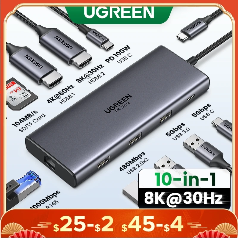 Comprar Ugreen dual HDMI USB HUB 8K HDMI Adaptador 10 en 1 divisor con RJ45 USB 3.0 PD 100W Dock para MacBook Pro Air M2 M1 USB C Hub