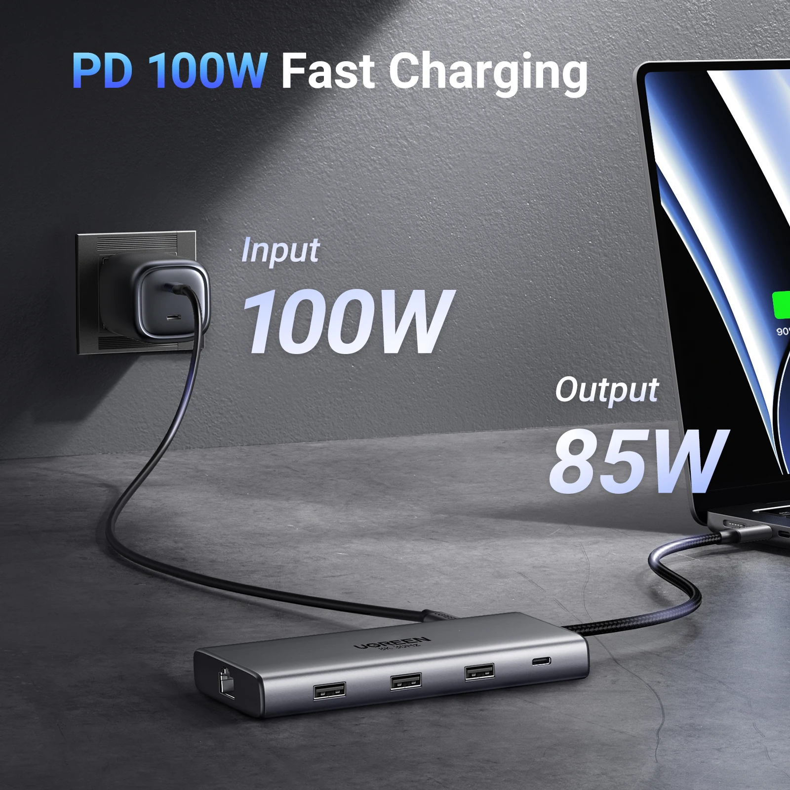1*8K@30Hz HDMI2 + 1*4K@60Hz HDMI1 + 1*1000Mbps RJ45 + 1*100W PD + 1*104MB/s. SD/TF + 1*USB-A 3.0 + 1*USB-C 3.0 + 2*USB-A 2.0