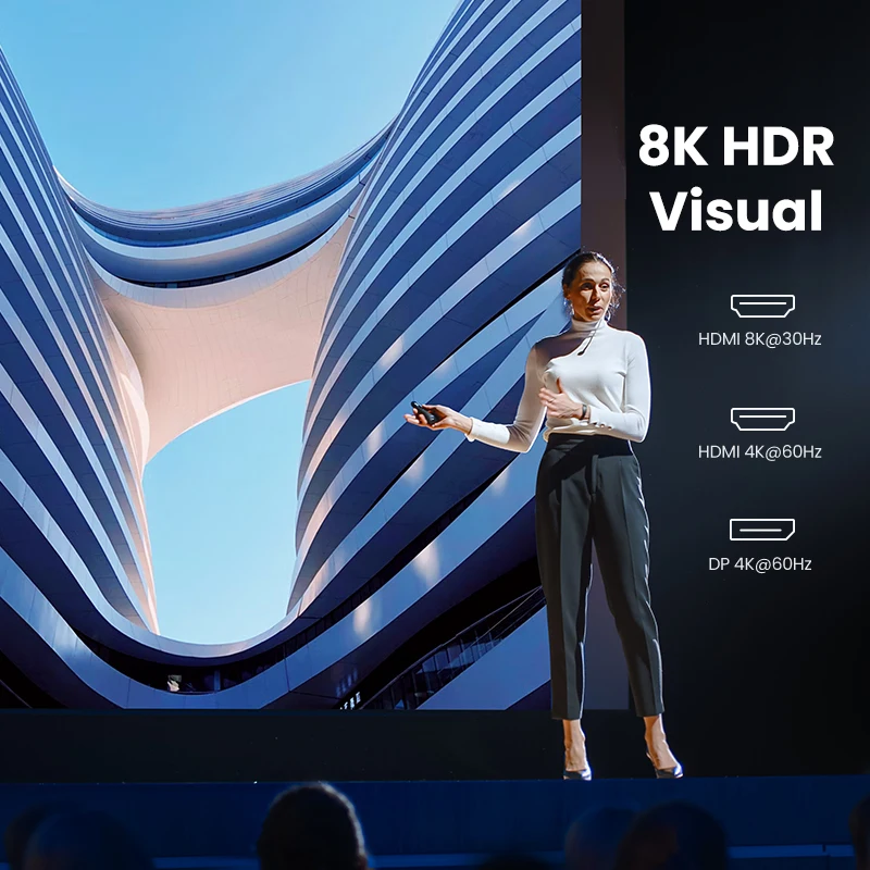 El Puerto HDMI2 de la estación de acoplamiento USB C admite hasta 8K a 30Hz en Windows y hasta 4K a 60Hz en Mac OS. Conéctese a través de los tres simultáneamente para disfrutar de una transmisión o duplicación nítida en 3 pantallas.