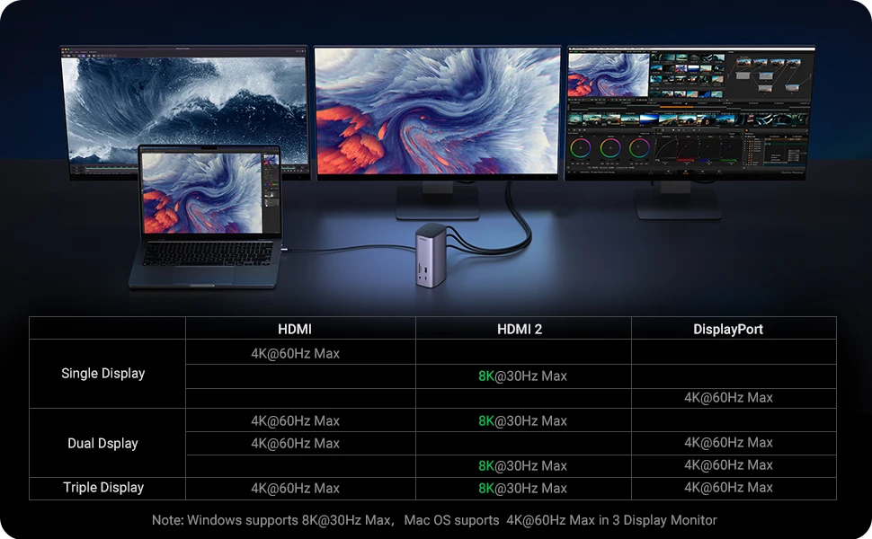 Nota:Windows admite 8K @ 30Hz Max, Mac OS admite 4K @ 60Hz Max en 3 monitores