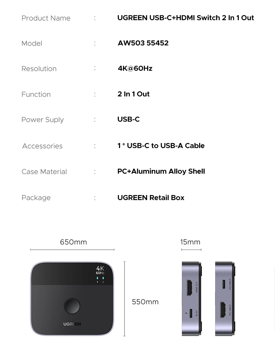 USB-C + interruptor HDMI 2 entrada 1 salida