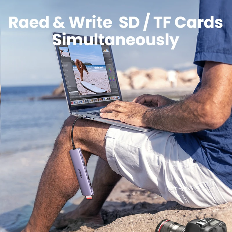 Las ranuras para tarjetas TF y SD admiten diferentes formatos de tarjetas de memoria (como SD, SDHC, Micro SD, MMC, SDXC) Y este adaptador USB C a USB puede leer tarjetas SD/TF simultáneamente a una velocidad de hasta 104 MB/s.