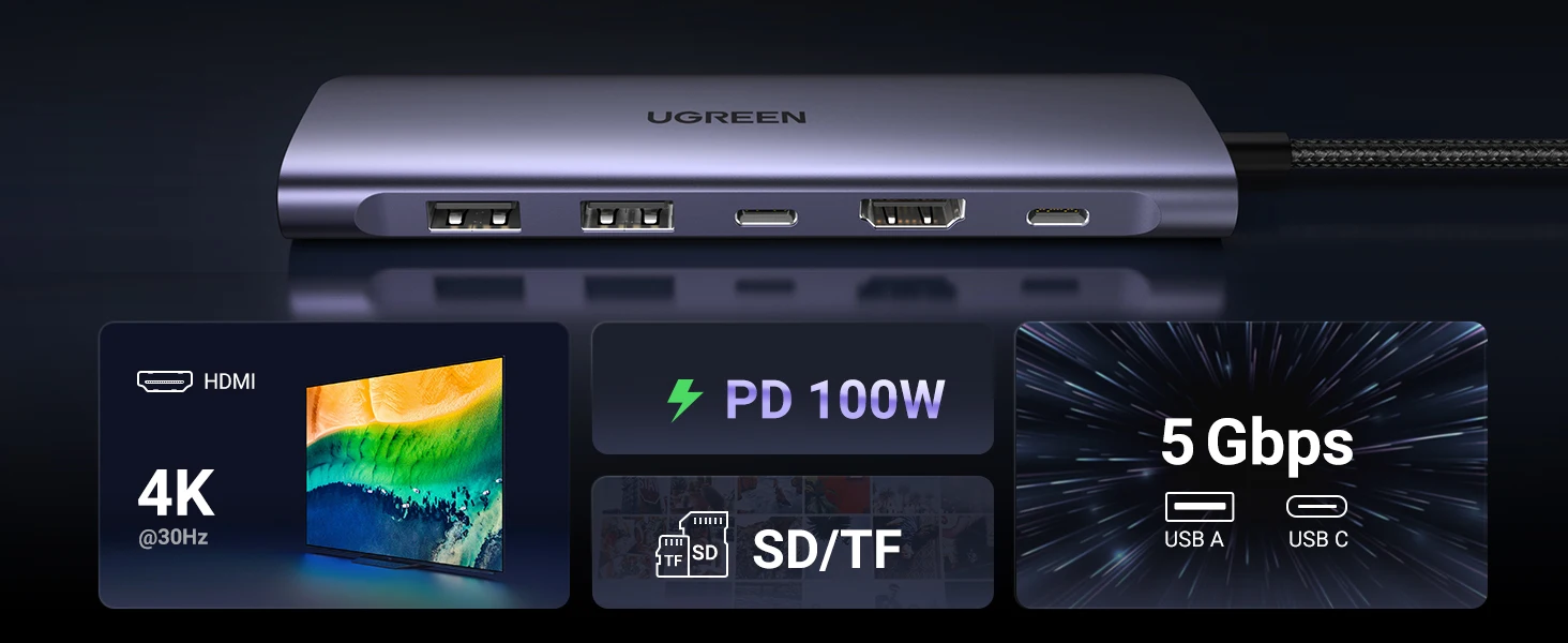 HDMI 4K30Hz + PD 100W + SD + TF + 2x USB3.0 + USB C 5Gbps