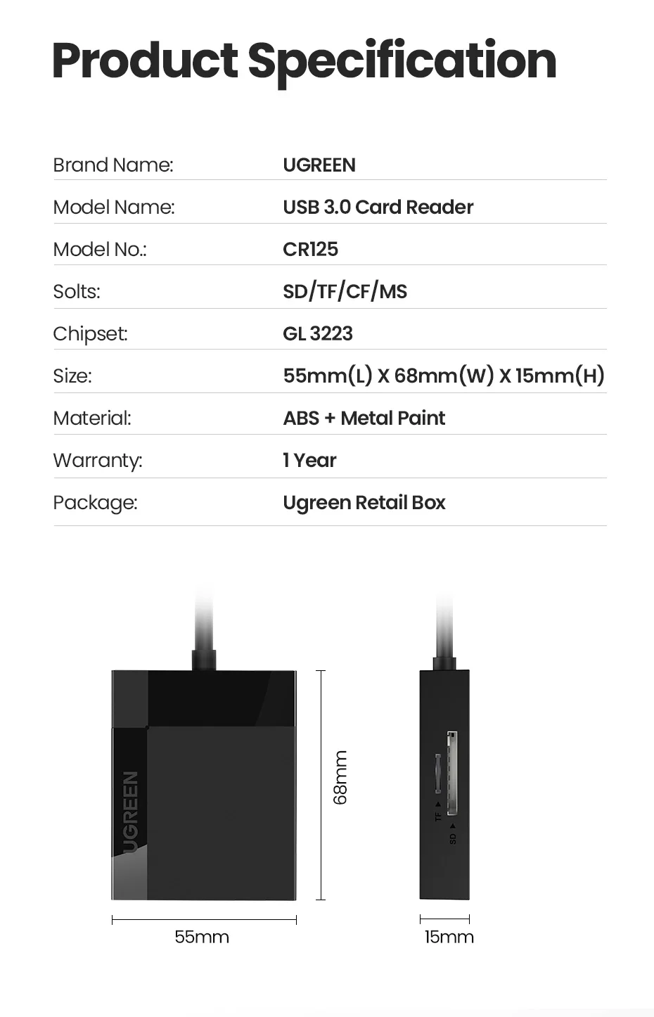 Lector de tarjetas UGREEN 4 en 1 USB 3.0 SD/TF/CF/MS,