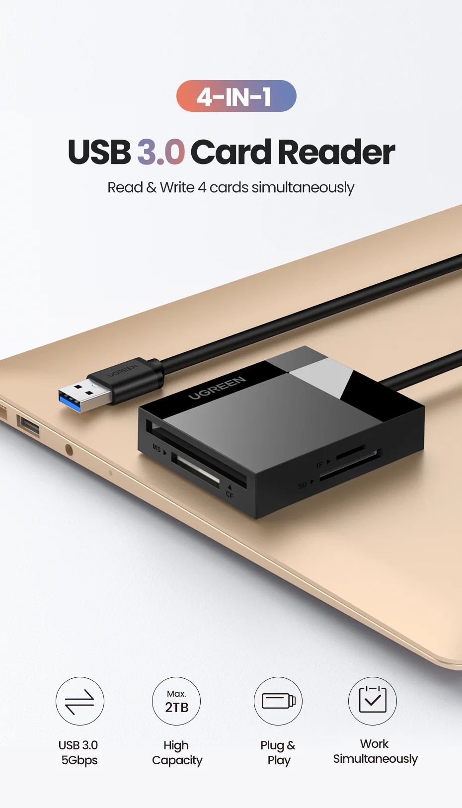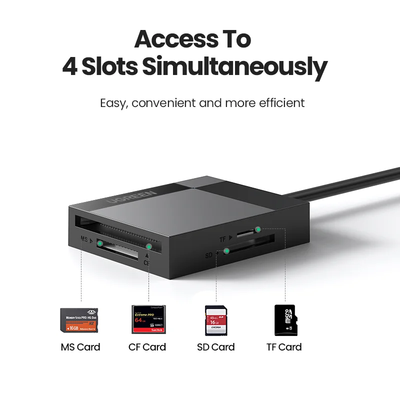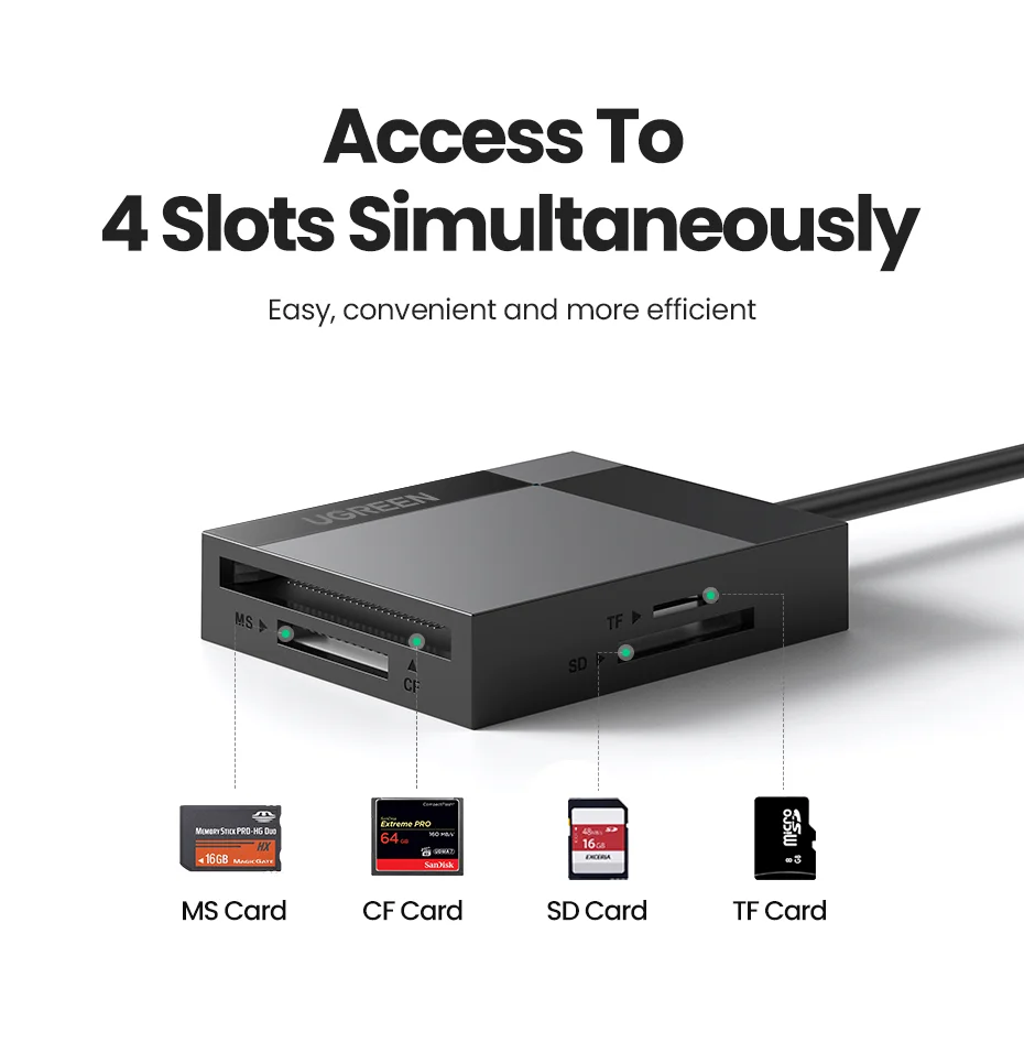 A diferencia de otros adaptadores de tarjetas de lectura única, el lector de tarjetas Ugreen le permite leer 4 tarjetas simultáneamente y lo mantiene alejado de la molestia de desconectar y volver a enchufar constantemente.