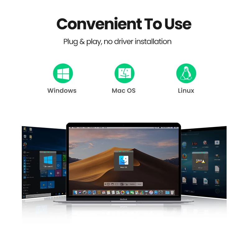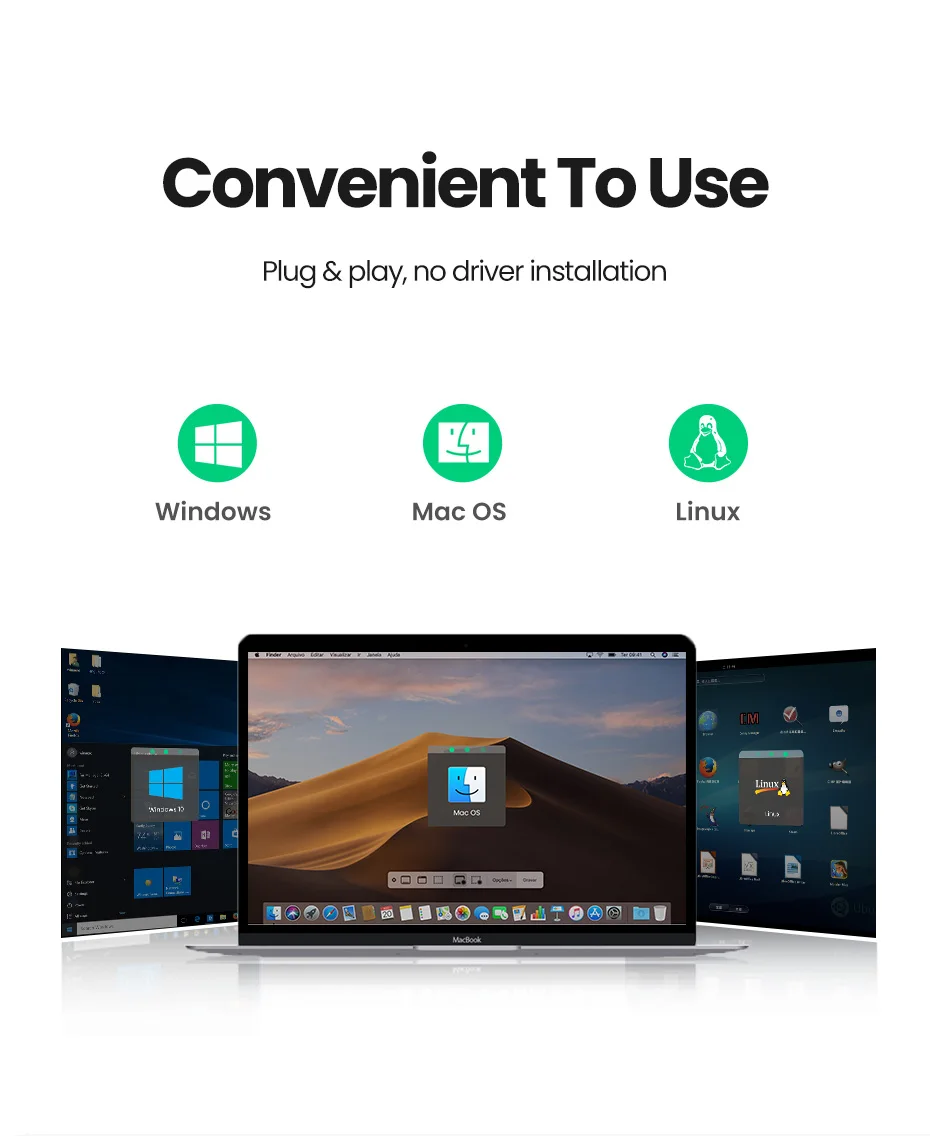 Plug and play en la computadora o computadora portátil equipada con un puerto USB 3.0 estándar con la mayoría de los sistemas operativos modernos, incluidos Windows XP/Vista/7/8/8.1/10, Mac OS, Linux.