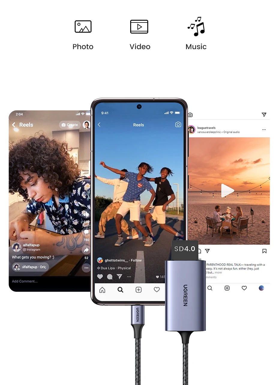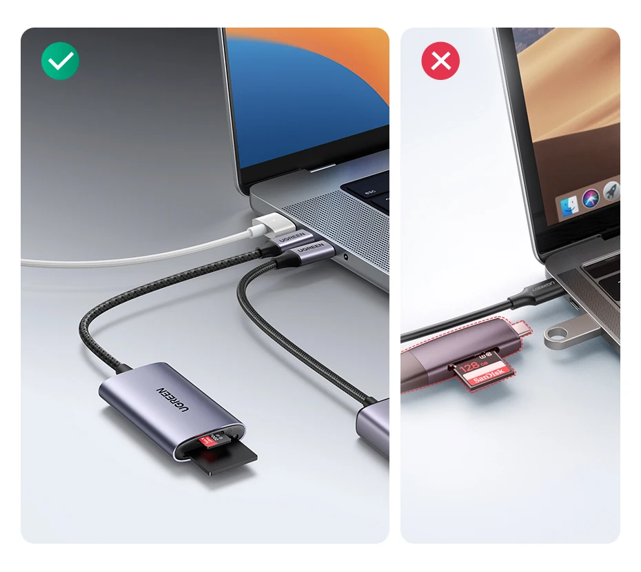Admite lectura y escritura de tarjetas duales simultáneamente. Puede usar una tarjeta SD y una tarjeta Micro SD al mismo tiempo para transferir imágenes o vídeos. No es necesario enchufar y desenchufar repetidamente.