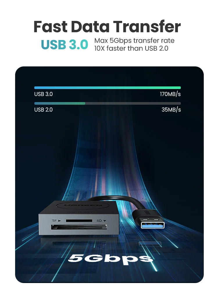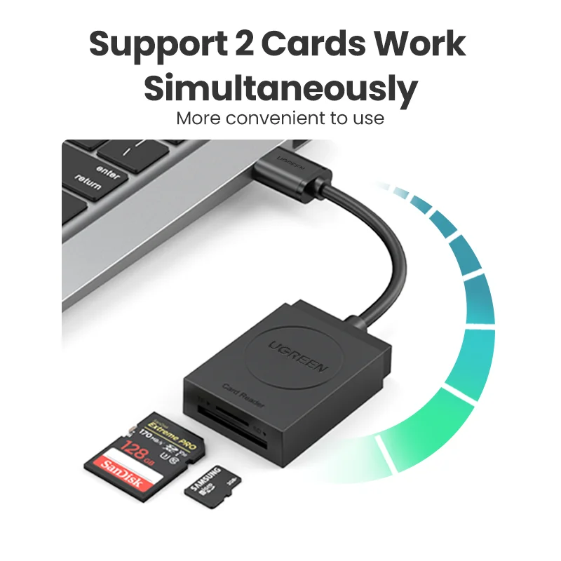 UGREEN USB 3.0 card reader easily expands SD and TF slot on your computer, it allows you to read and write on 2 cards simultaneously and keep you away from the hassle of constant unplugging and re-plugging.