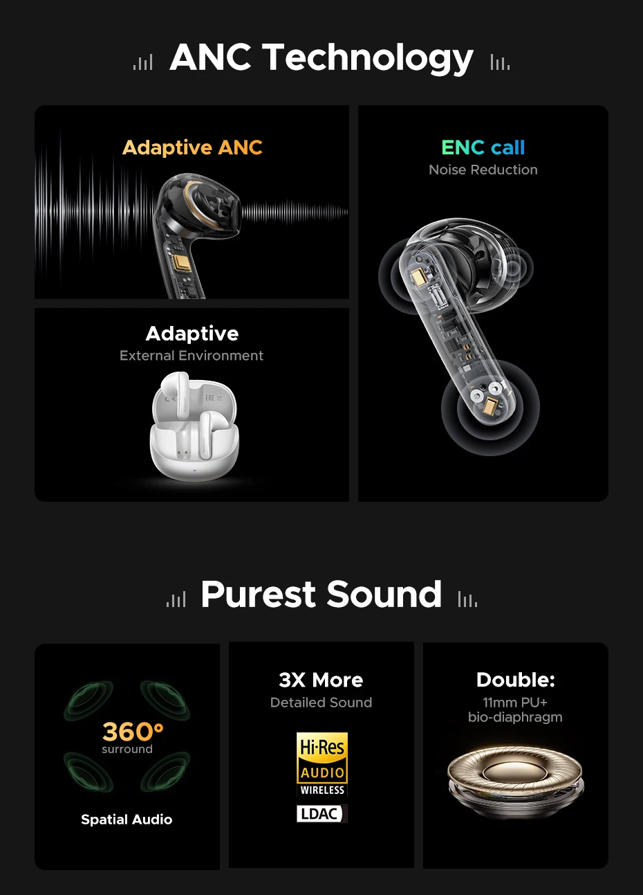 Cuando estoy triste, escucho música. O compro auriculares :). Peso hacia un sonido honesto, no me gustan los ecualizadores. De géneros favoritos, electrónica y clásica. He usado auriculares inalámbricos antes, ahora tengo los myst nail 2 con cable, hifiman he400 y ugreen ProStudio a mano. Estos modelos, en comparación con ProStudio, reproducen agudos un poco menos pronunciados, los graves son suficientes y los medios son satisfactorios. El sonido es claro, asegúrate de habilitar FLAC en la aplicación. Hice un reinicio completo después de emparejar con el teléfono. Además, cambié las almohadillas por unas más grandes; el aislamiento acústico ha mejorado significativamente. Como auriculares de viaje, para el metro, autobús y otros lugares donde los auriculares grandes o sumergibles no son muy adecuados, estos deberían funcionar bien. El sensor es lento, pero de todos modos no tenía pensado usarlo. El estuche está ensamblado para 4K, lo coloqué en un estuche para gafas.