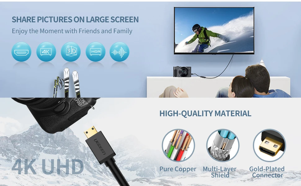 El cable Ugreen Mini HDMI macho a HDMI hembra es ideal para conectar Raspberry Pi Zero W, cámara DSLR, proyector Pico, tarjeta gráfica de vídeo, videocámara con puerto Mini HDMI a HDMI TV, HDTV, monitor o proyector.Le permite ver videos o imágenes de alta definición en el hogar, la oficina o la sala de conferencias.