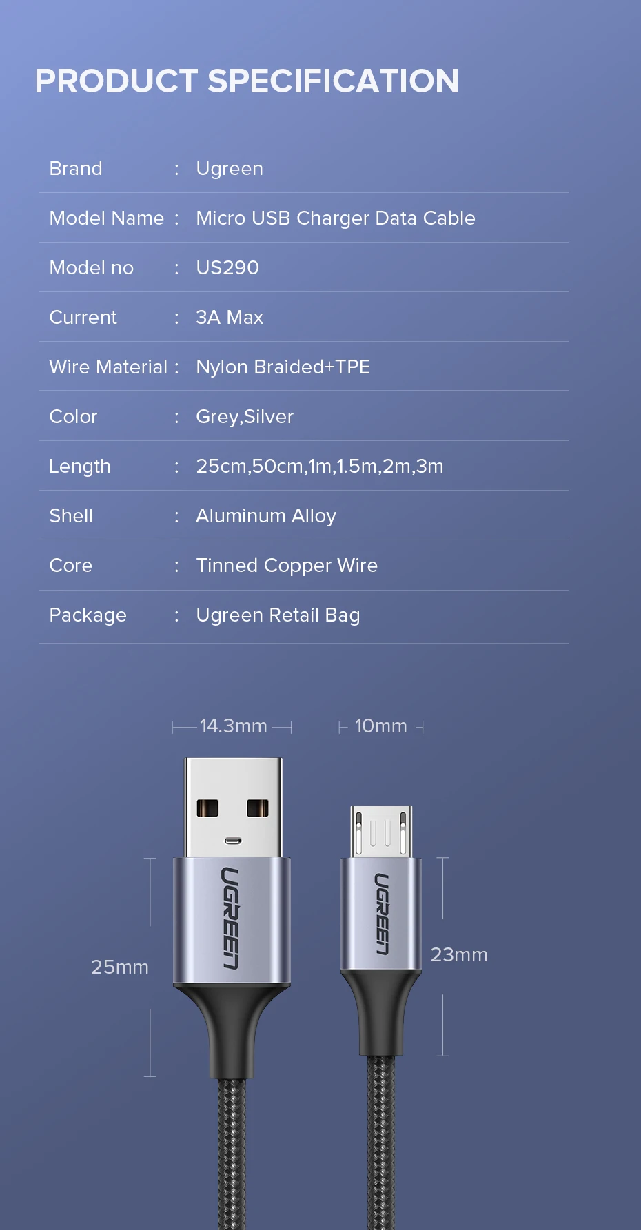 Comprar UGREEN Paquete de 2 cables micro USB 3A Cable USB de carga rápida de 1,5 m para Samsung Xiaomi HTC Cable de datos del cargador USB Cable del teléfono móvil