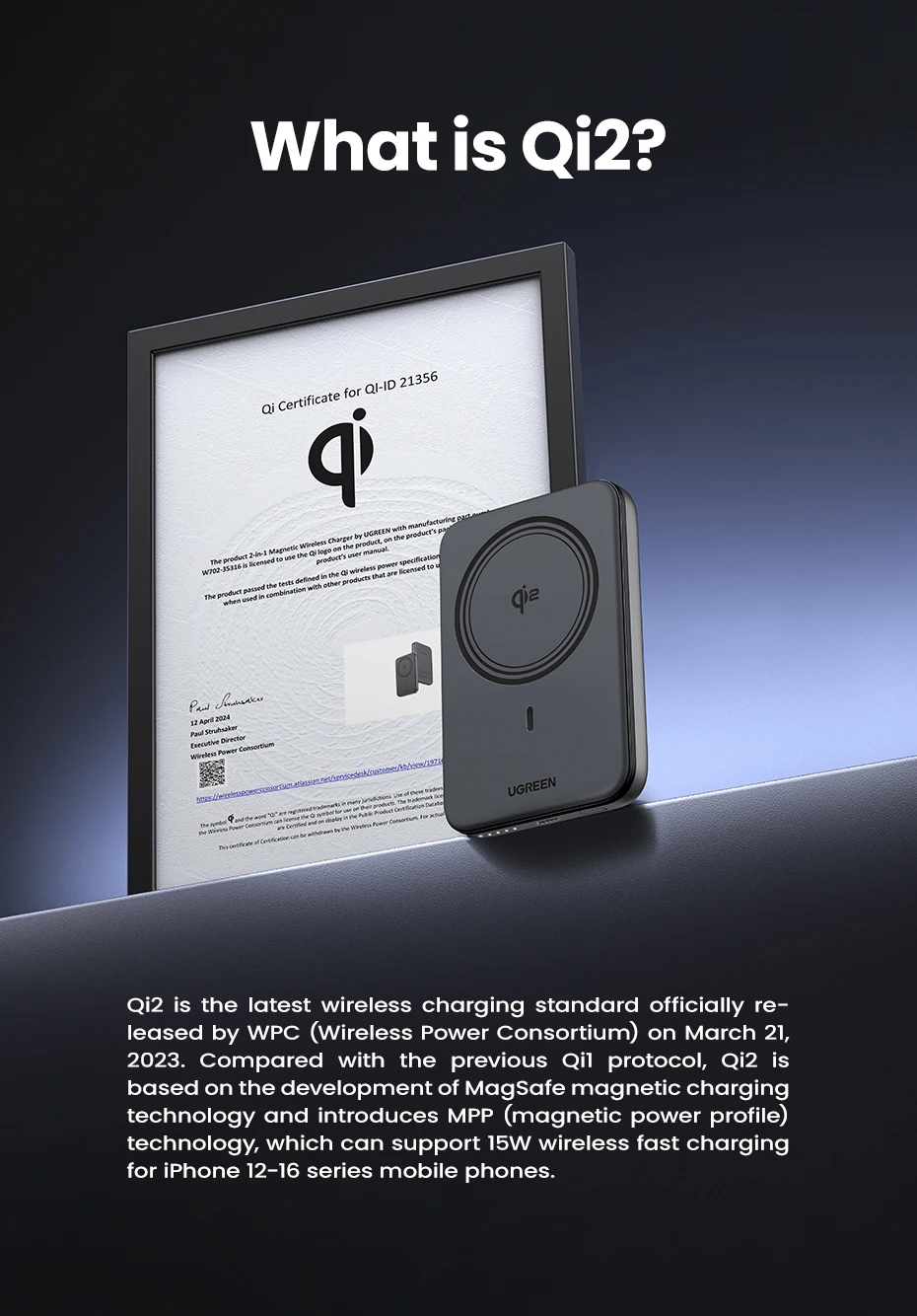 Qi2 es el último estándar de carga inalámbrica lanzado oficialmente por WPC (Wireless Power Consortium) el 21 de marzo de 2023.En comparación con el protocolo Qi1 anterior, Qi2 se basa en el desarrollo de la tecnología de carga magnética MagSafe e introduce la tecnología MPP (perfil de potencia magnético), que puede admitir carga rápida inalámbrica de 15 W para teléfonos móviles de la serie iPhone 12-15.