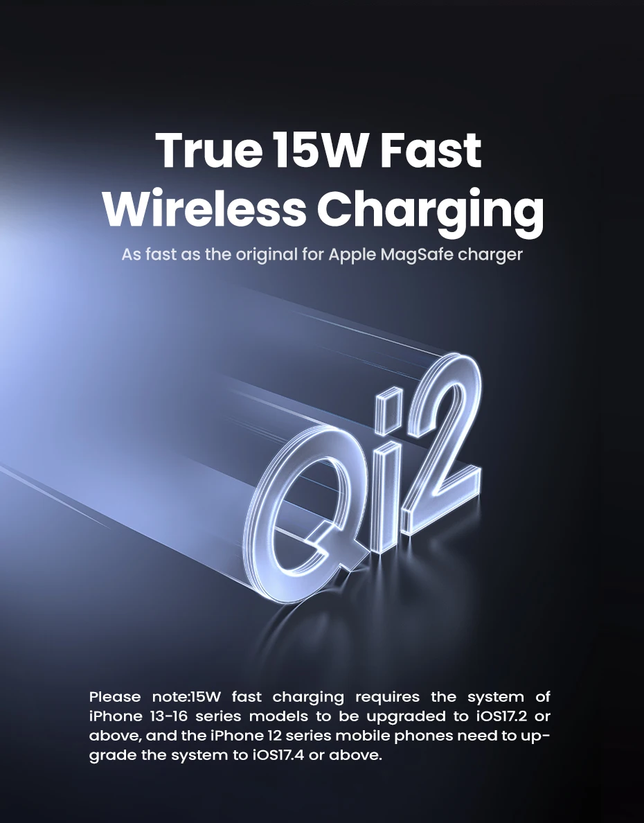 Tenga en cuenta: la carga rápida de 15 W requiere que el sistema de los modelos de la serie iPhone 13-15 se actualice a iOS17.2 o superior, y los teléfonos móviles de la serie iPhone 12 necesitan actualizar el sistema a iOS17.4 o superior.