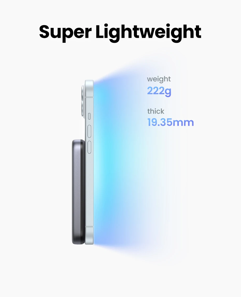 Entre la misma capacidad de 10000 mAh, es extremadamente delgado y liviano: solo 19,35 mm de grosor.