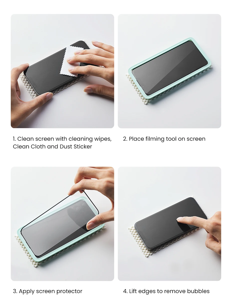 3. Coloque el teléfono móvil en una mesa plana antideslizante, alinee la herramienta de película con el teléfono móvil e insértela