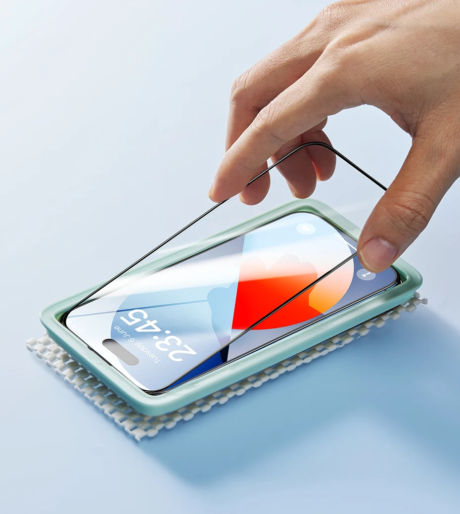 5. Alinee la película templada con el orificio de la pantalla y colóquela