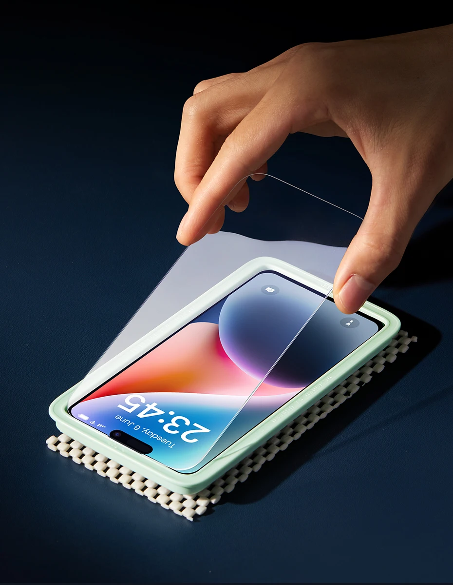 5. Alinee la película templada con el orificio de la pantalla y colóquela
