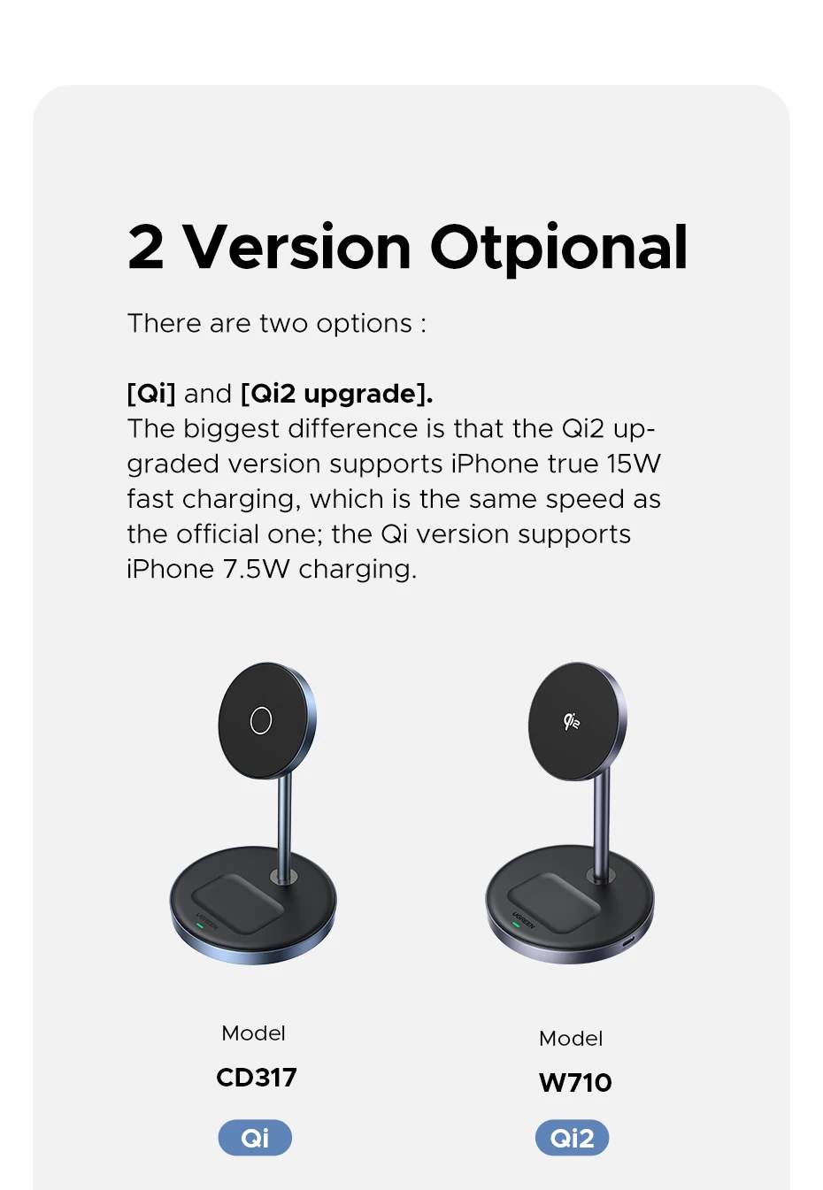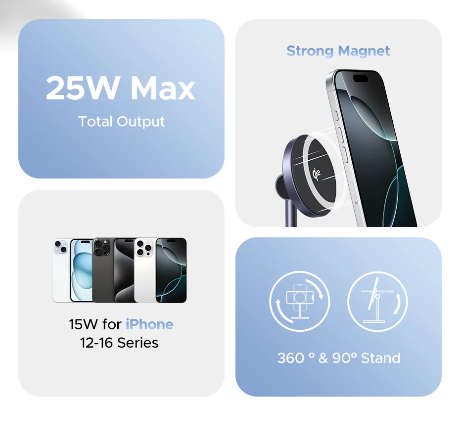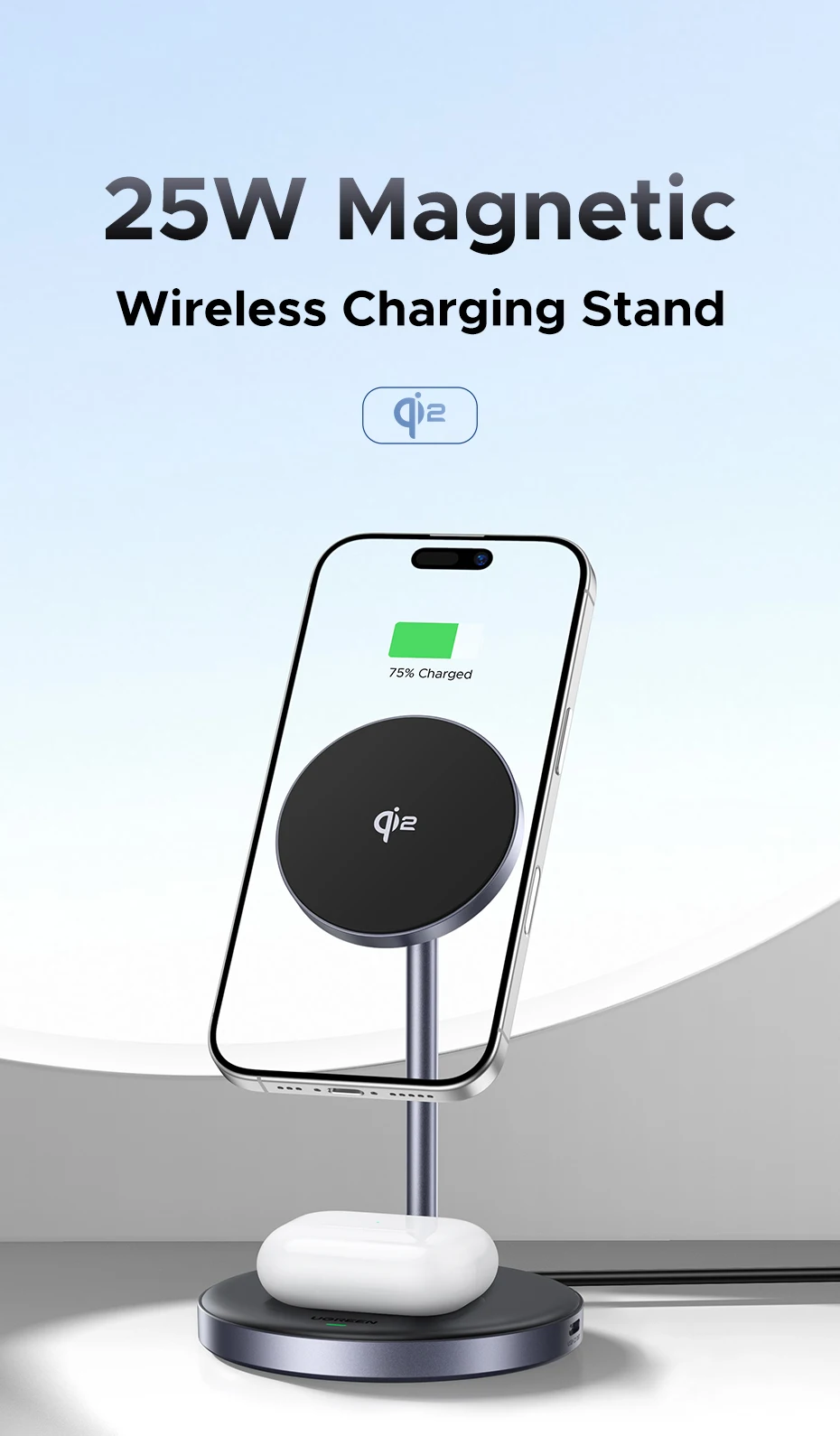 Qi2 25W máx.Soporte de carga magnético 2 en 1Carga inalámbrica para iPhone y auriculares