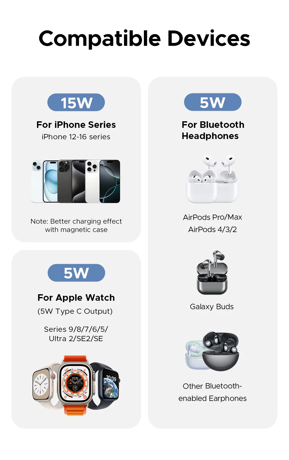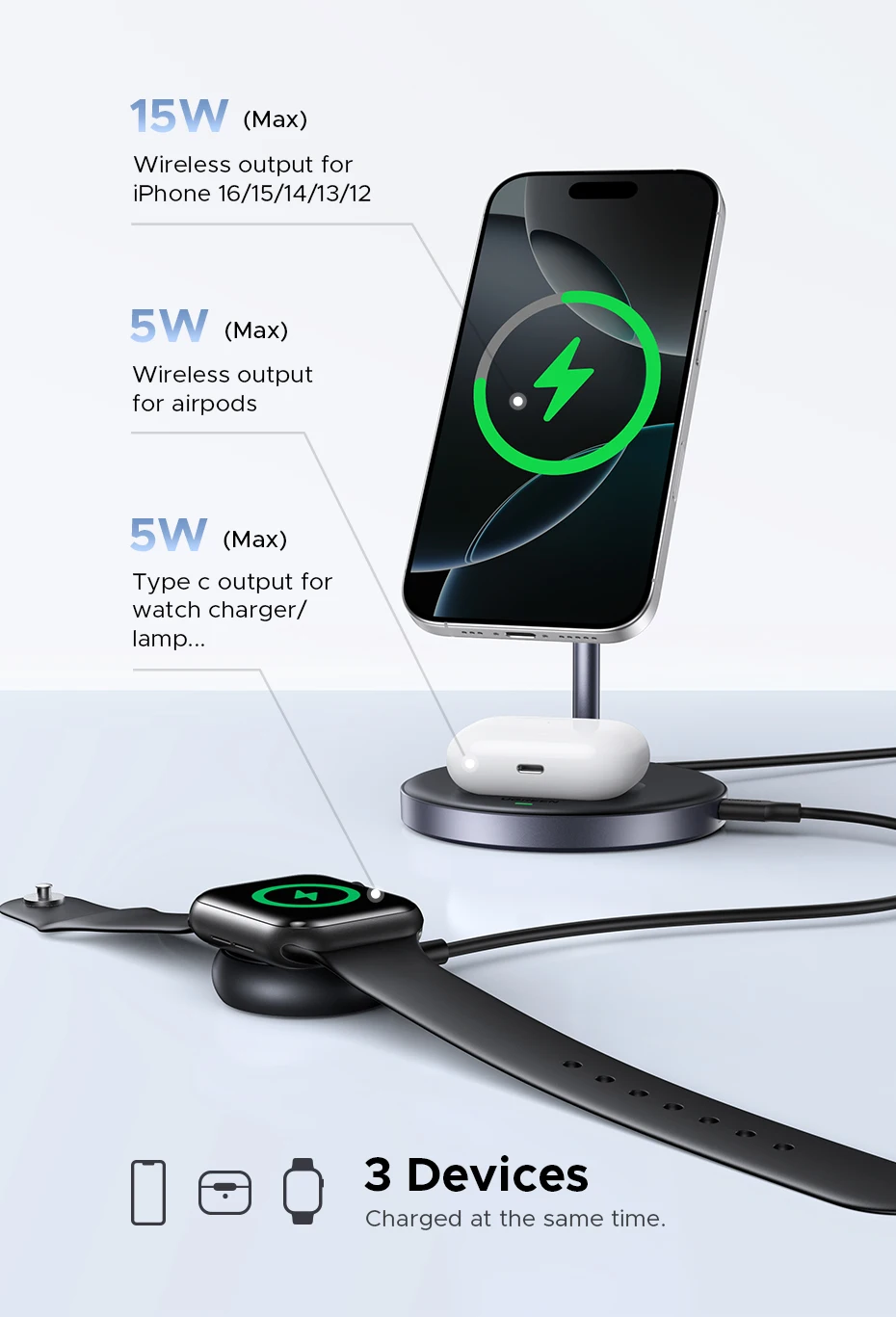 Salida de 15 W (máx.) para la serie iPhone, salida de 5 W (máx.) para AirPods. Puerto tipo C de 5 W para cargador/lámpara de reloj, etc.