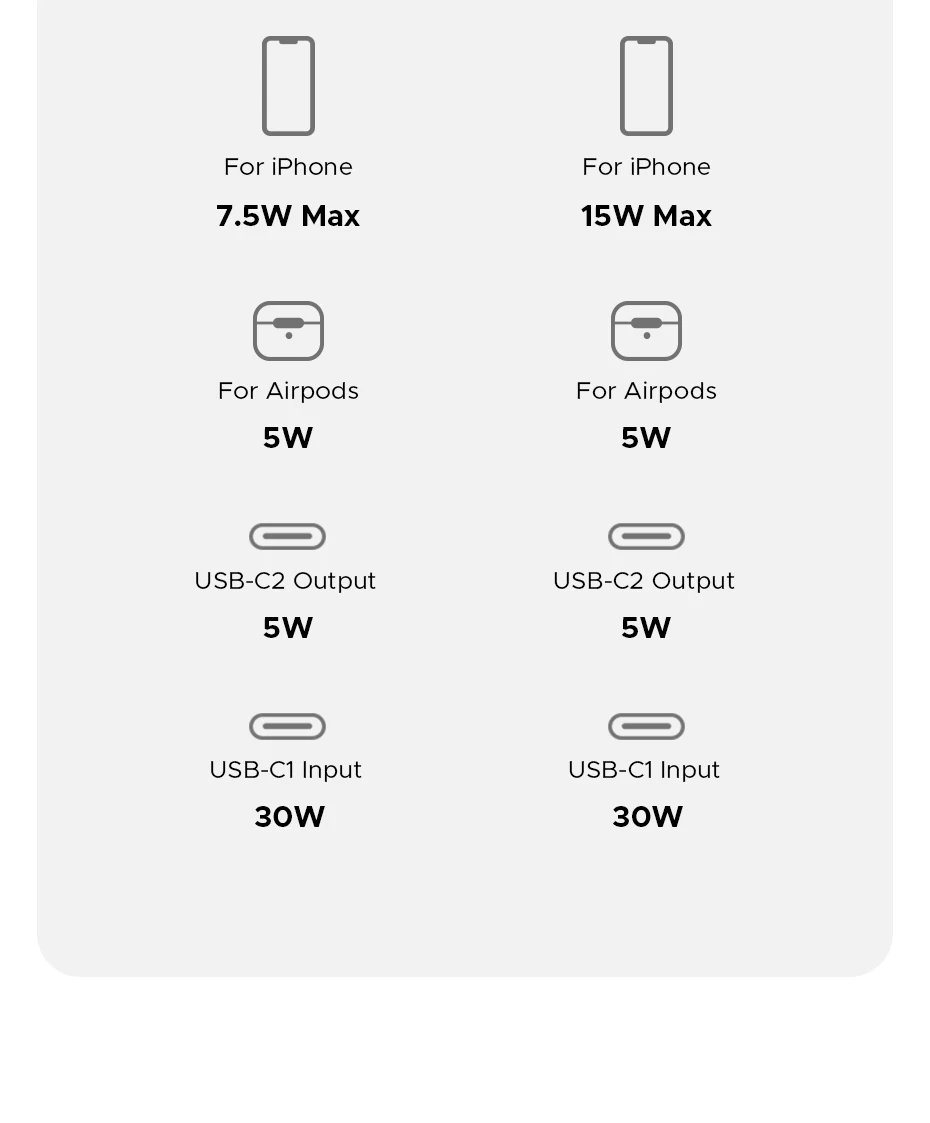 Salida de 15 W (máx.) para la serie iPhone, salida de 5 W (máx.) para AirPods. Puerto tipo C de 5 W para cargador/lámpara de reloj, etc.