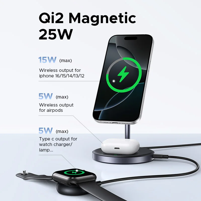 Qi2 25W máx.Soporte de carga magnético 2 en 1Carga inalámbrica para iPhone y auriculares