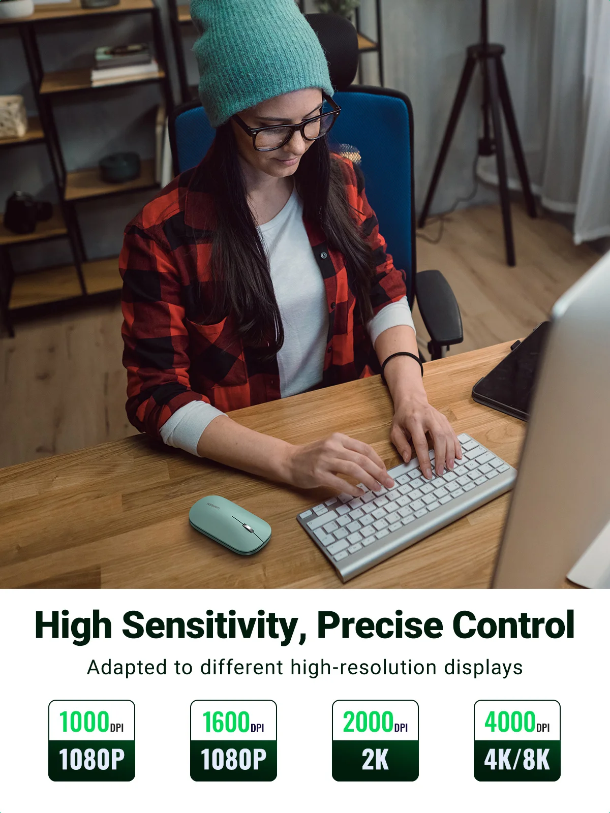 Los niveles de DPI de este ratón inalámbrico cambian entre 1000/1600/2000/4000 para satisfacer sus necesidades especiales con mayor sensibilidad. Restaure con precisión los movimientos en funcionamiento a alta velocidad, perfectamente para pantallas 4K/8K HD.