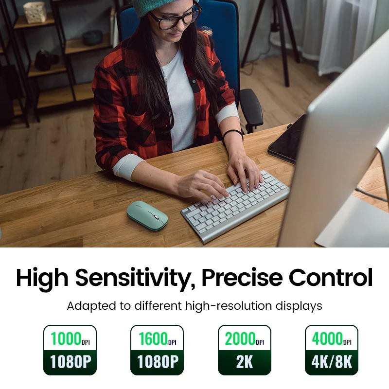 Los niveles de DPI de este ratón inalámbrico cambian entre 1000/1600/2000/4000 para satisfacer sus necesidades especiales con mayor sensibilidad. Restaure con precisión los movimientos en funcionamiento a alta velocidad, perfectamente para pantallas 4K/8K HD.