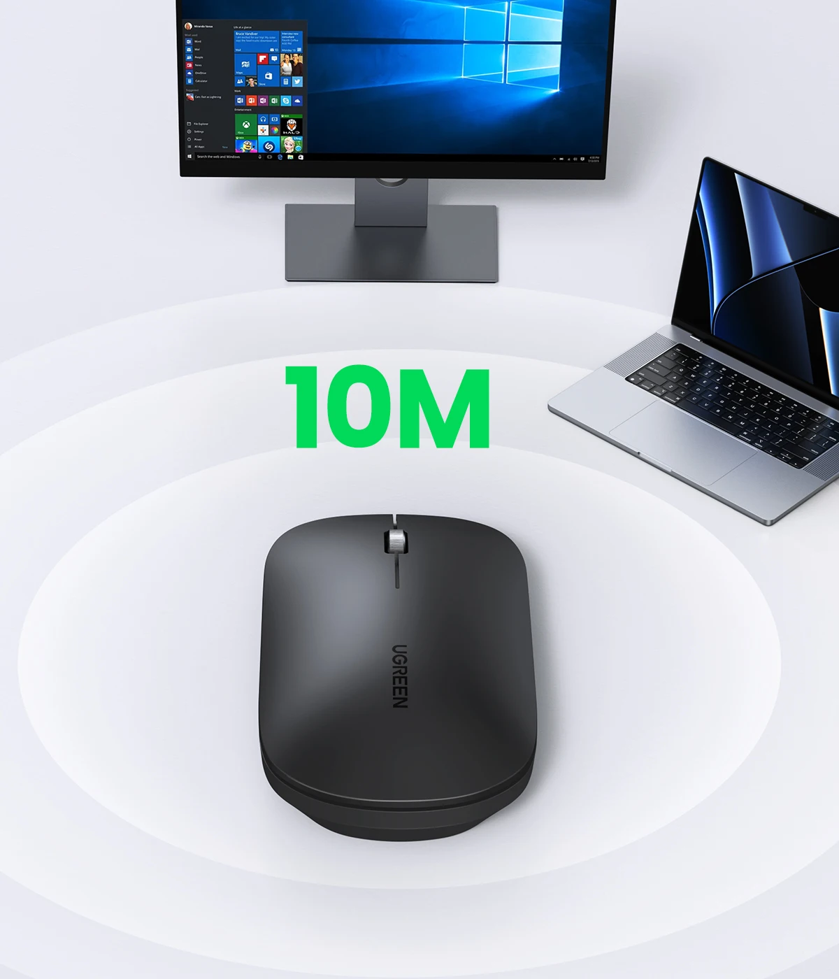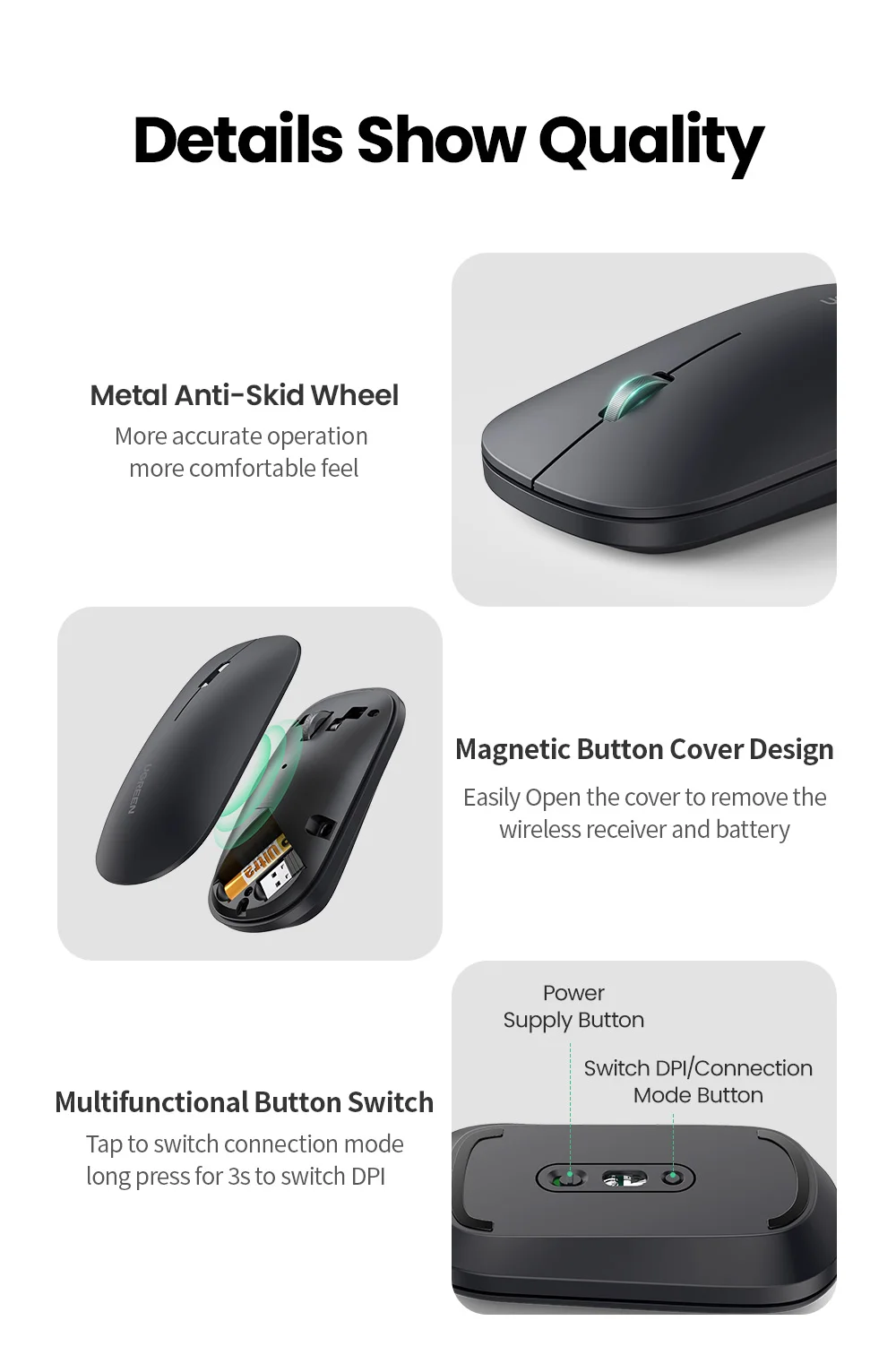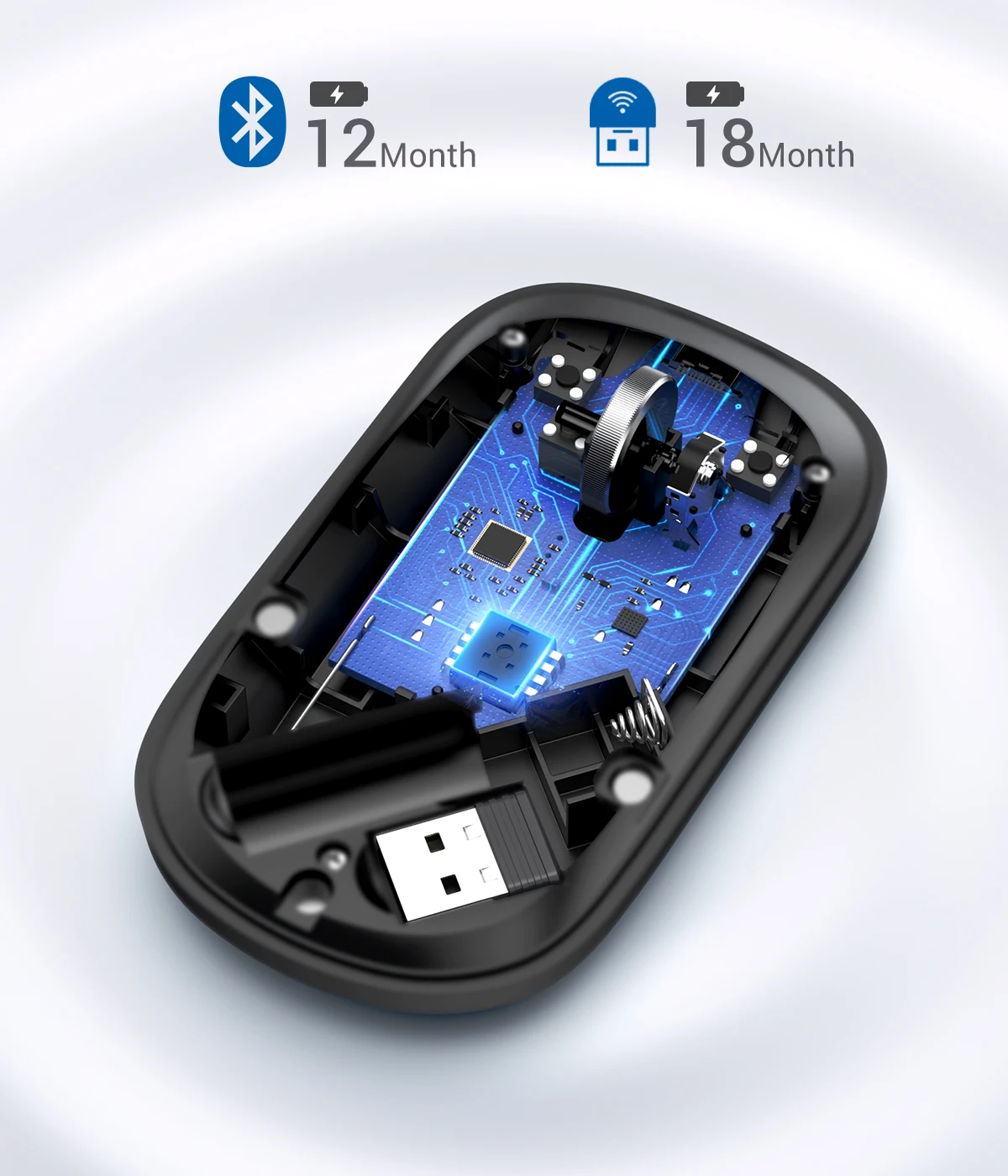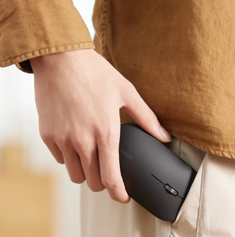 Chip de proceso avanzado adoptado con tecnología inteligente de ahorro de energía, ratón inalámbrico UGREEN con una duración de batería de hasta 18 meses. Nota: El ratón de PC está alimentado por una batería 1AA (no incluida). Nota: El receptor USB se almacena en el ratón inalámbrico. Abra la cubierta y verá que está al lado de la ranura de la batería.