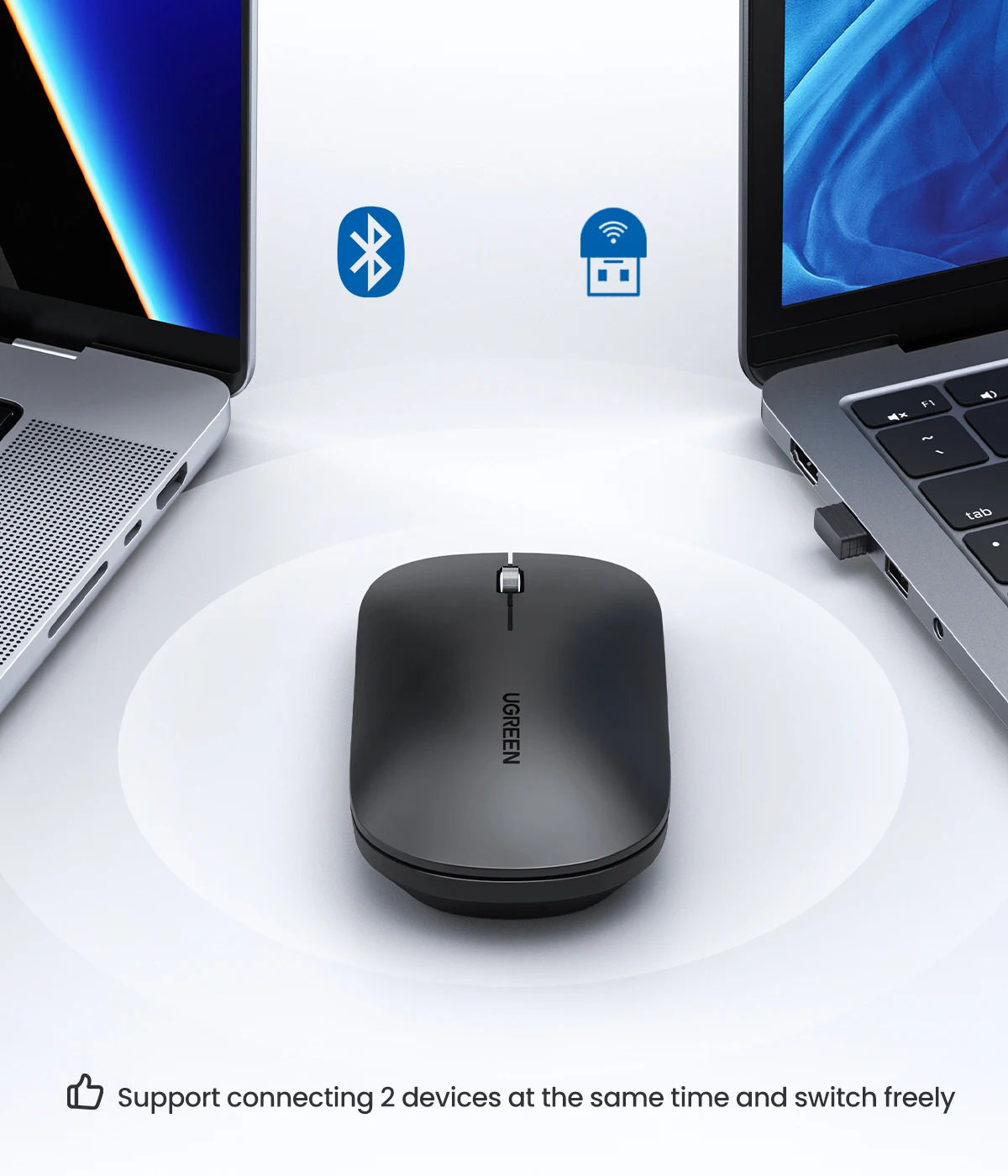 Este ratón tiene dos modos: Bluetooth G y 2,4, por lo que admite la conexión de 2 ordenadores al mismo tiempo. Un ordenador está conectado a través del receptor USB modo 2,4G, el otro está conectado a través de Bluetooth, ySe puede cambiar entre 2 ordenadoresPulsando el botón del interruptor en la parte inferior del ratón.