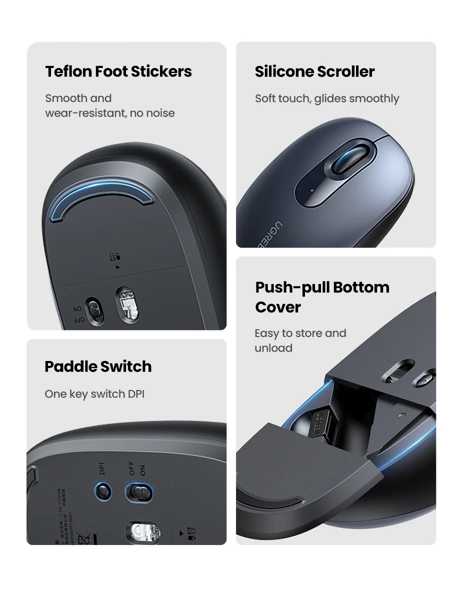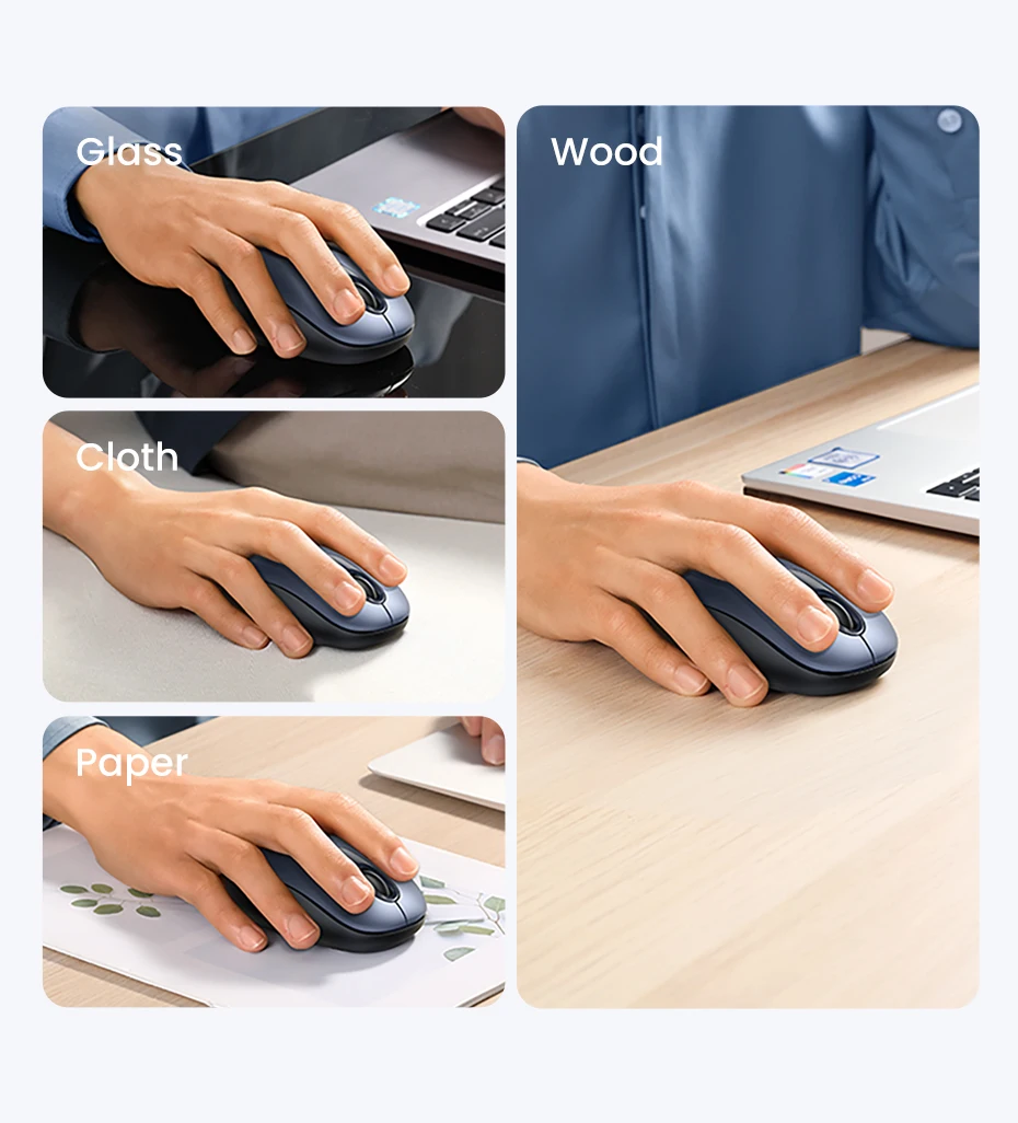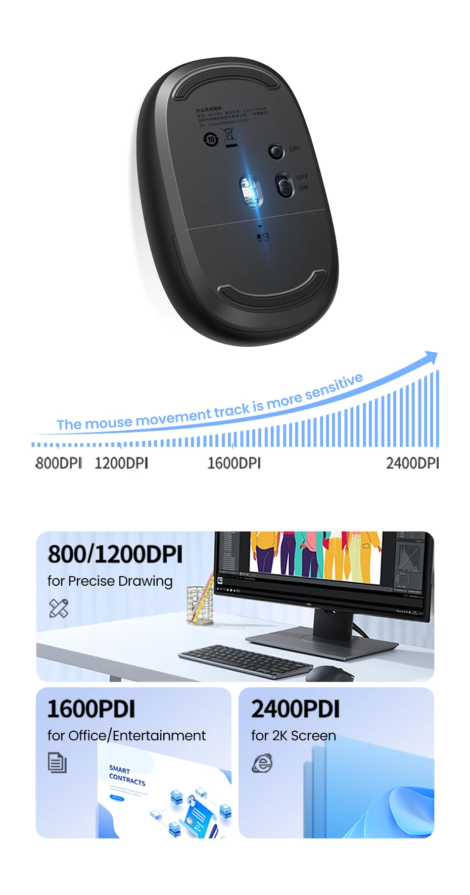 Un DPI ajustable (nivel 2400/1600/1200/800) del ratón inalámbrico para portátil proporciona la sensibilidad perfecta para cualquier tarea. El sensor óptico suave y preciso permite un seguimiento rápido y preciso, particularmente durante el funcionamiento a alta velocidad y varias superficies.