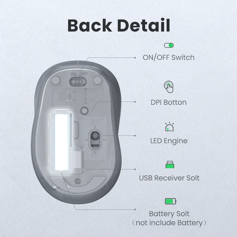 Interruptor ON/OFF ON, botón DPI, motor LED, receptor USB Solt, batería Solt