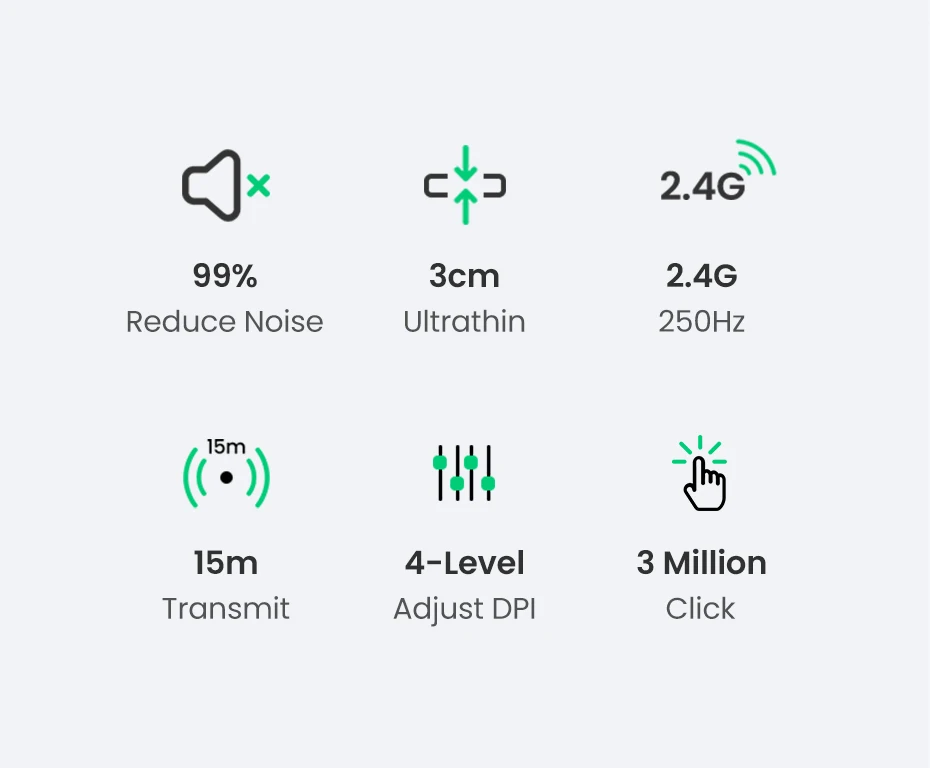 •Transmisión de largo alcance de 15m•2,4G Transmisión inalámbrica•Larga vida útil de 3 millones de clics