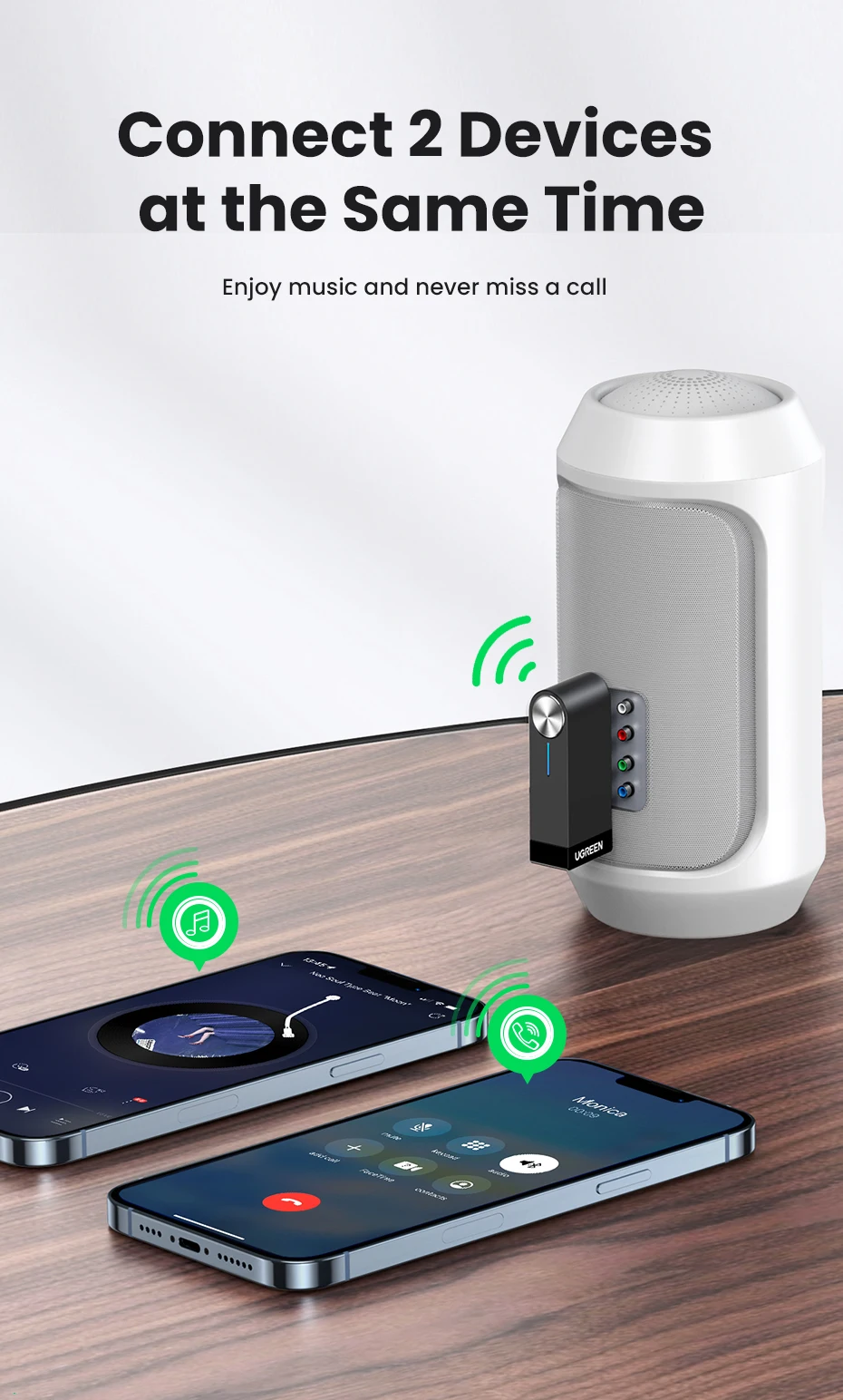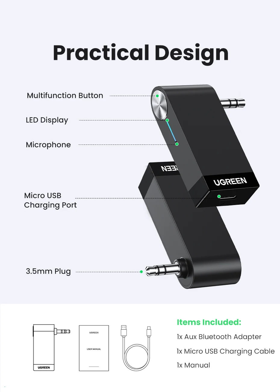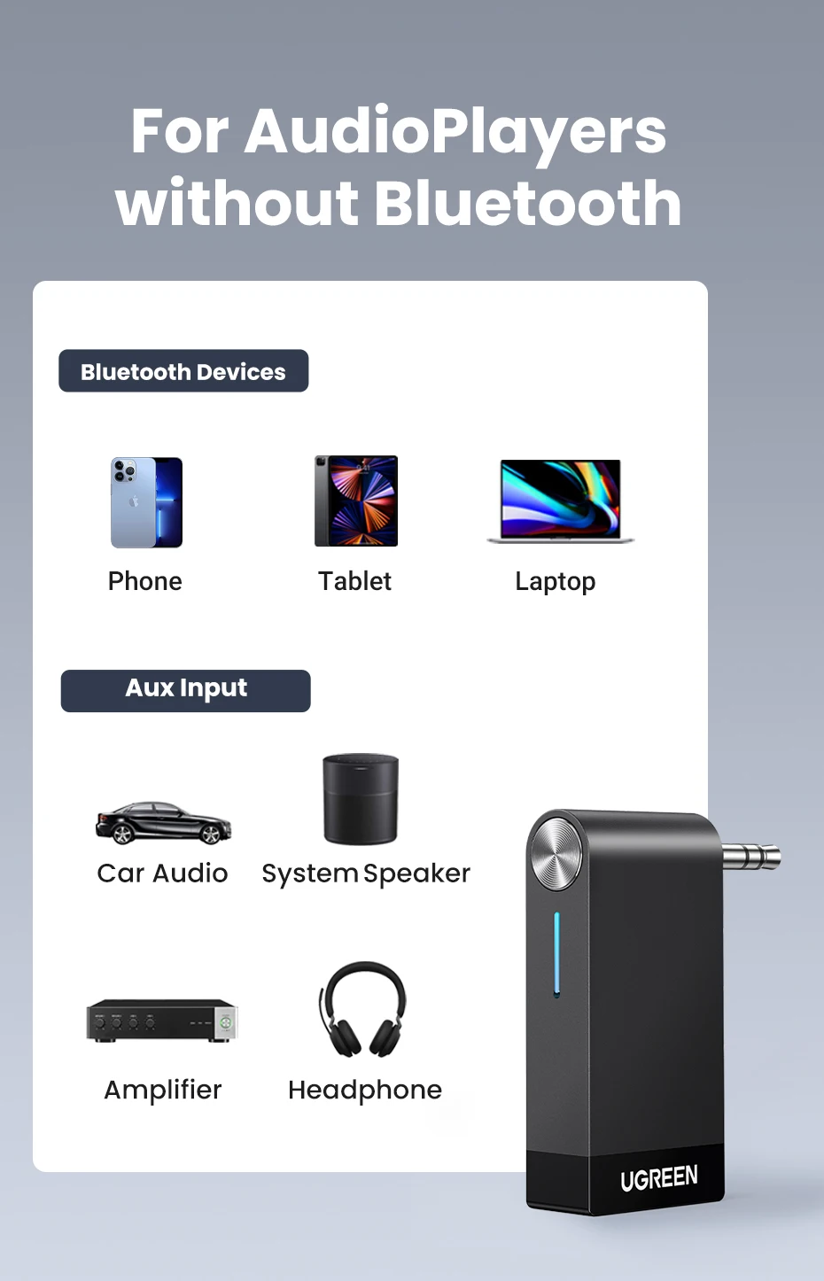 Comprar UGREEN-receptor AUX Bluetooth 3,5mm para coche, adaptador Bluetooth portátil para coche, auriculares estéreo/con cable para casa