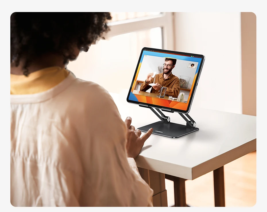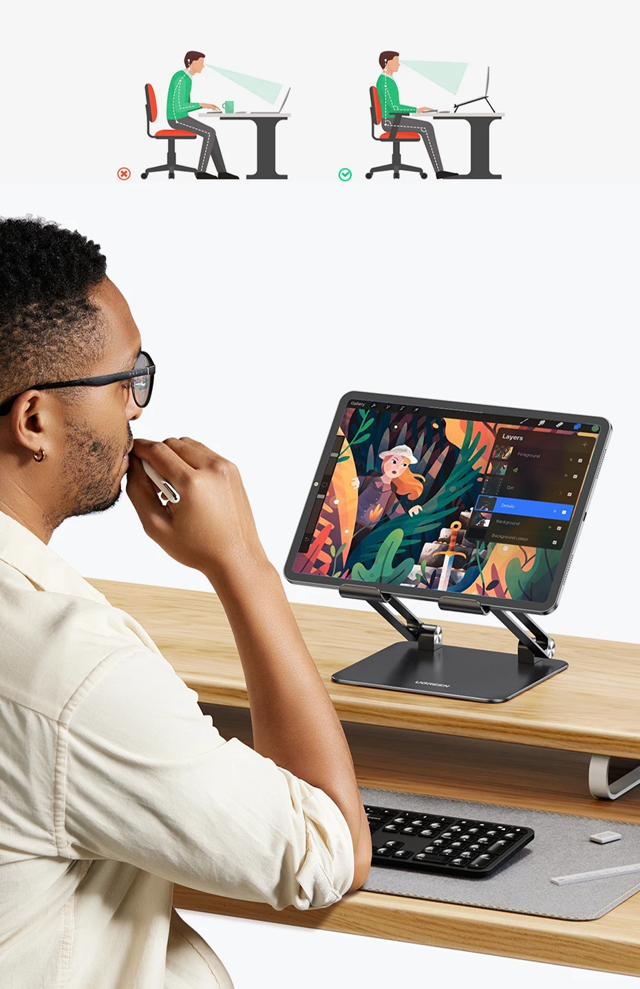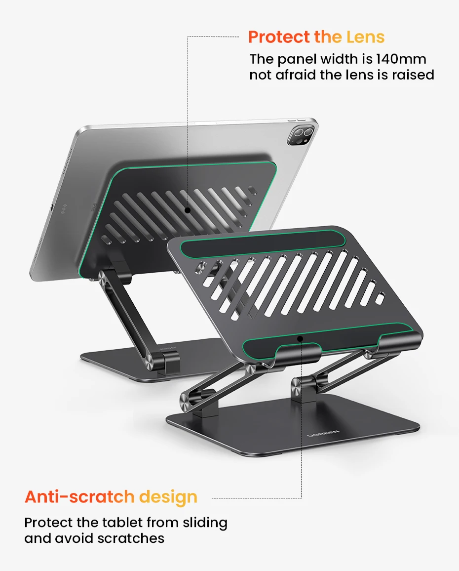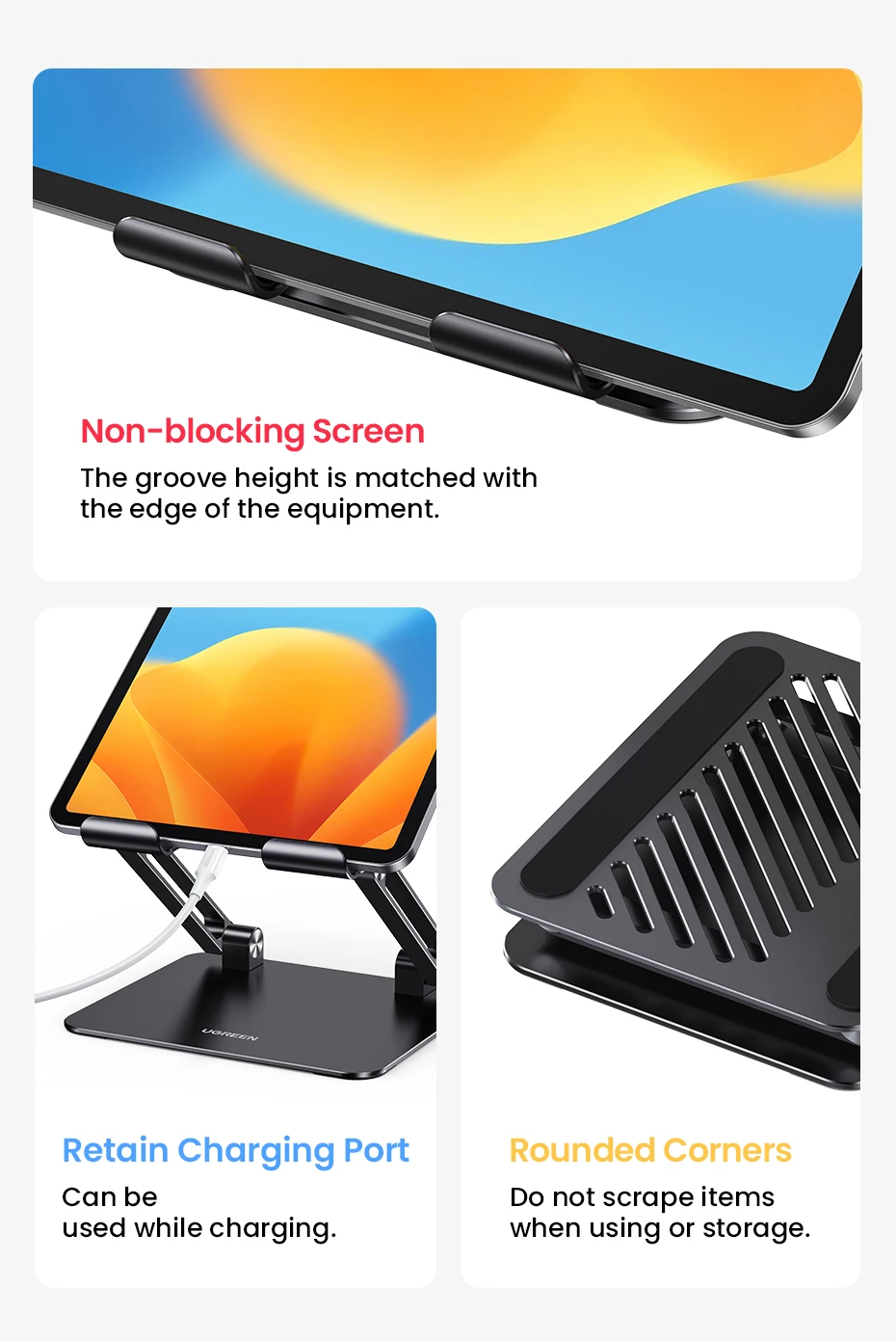 Soporte de tableta UGREEN para escritorio con inclinación hacia adelante y el diseño de estilo abierto permite el flujo de aire para su iPad, no más preocuparse por el sobrecalentamiento.