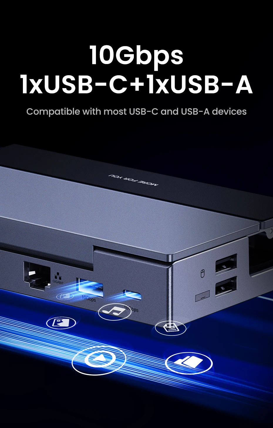 Expansión 9 en 1 con 1xHDMI 4K @ 60Hz + 1xUSB-C 3,2 10Gbps + 1xUSB-A 3,2 10Gbps + 1xRJ45 1000Mbps + 1xPD 100W + 1xSD 104 MB/s + 1xTF 104 MB/s + 2xUSB-A 2,0