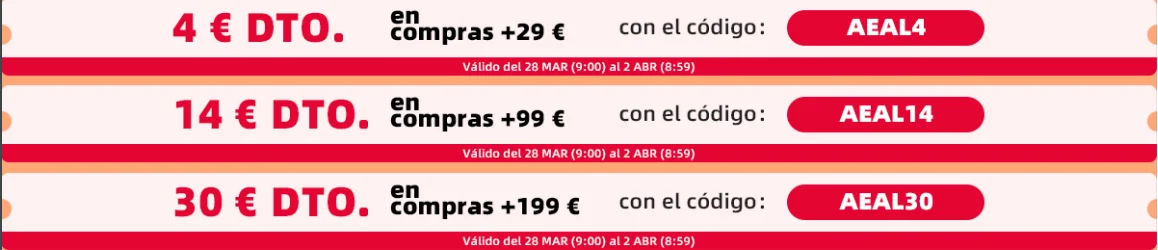 Promo Code: "328FR04" €4 (Order of €20 or more)Promo Code: "328FR07" €7 (Order of €50 or more)Promo Code: "328FR15" €15 (Order of €110 or more)Promo Code: "328FR22" €22 (Order of €149 or more)Promo Code: "328FR30" €30 (Order of €199or more)Promo Code: "328FR45" €45 (Order of €299or more)Promo Code: "328FR60" €60 (Order of €399or more)