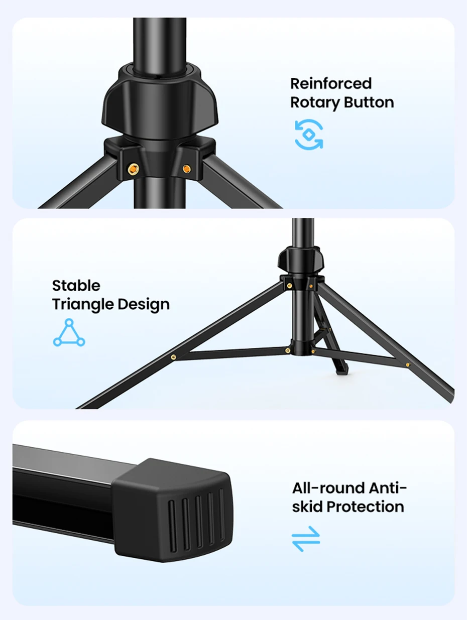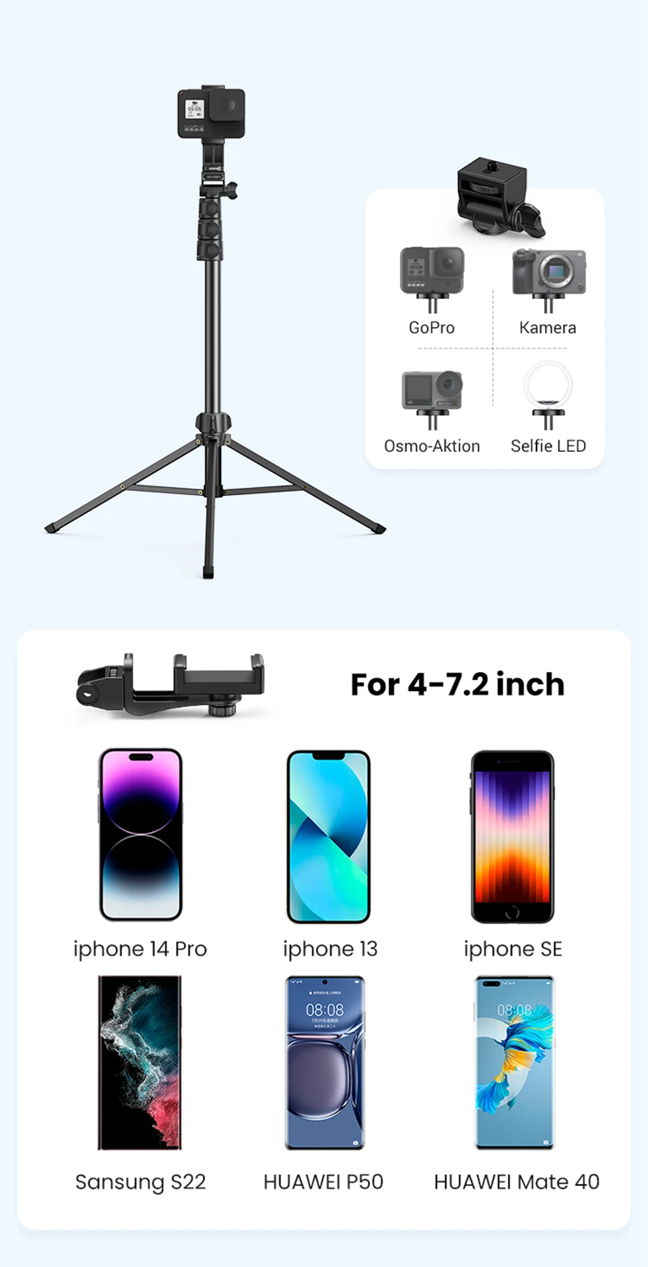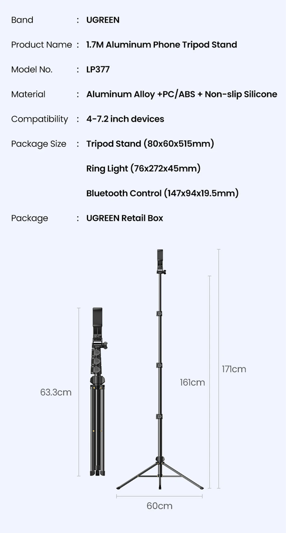 Con una longitud plegada compacta de 52cm y un peso de 634G, el trípode UGREEN es portátil para viajes, hogar y oficina.