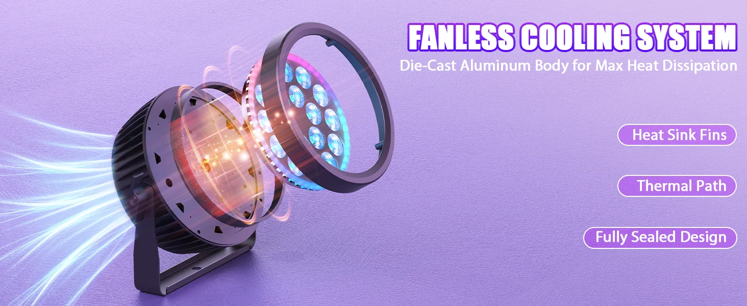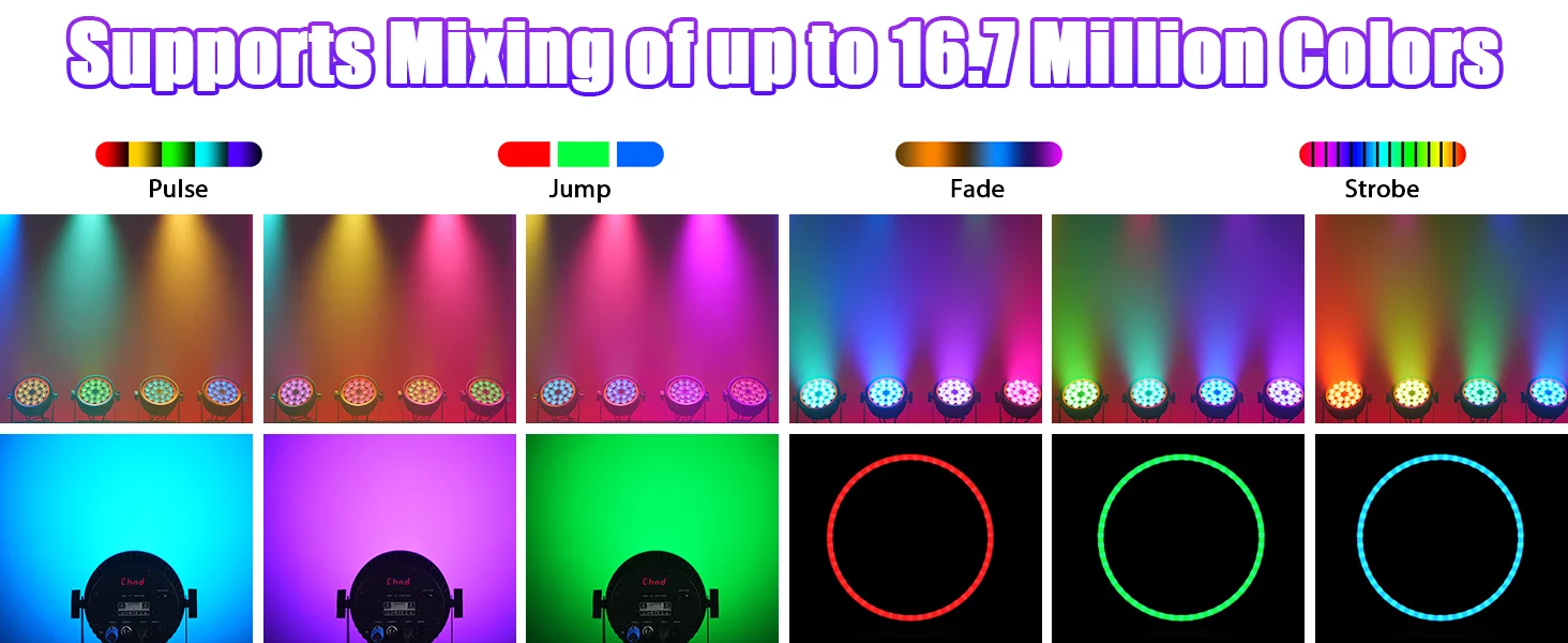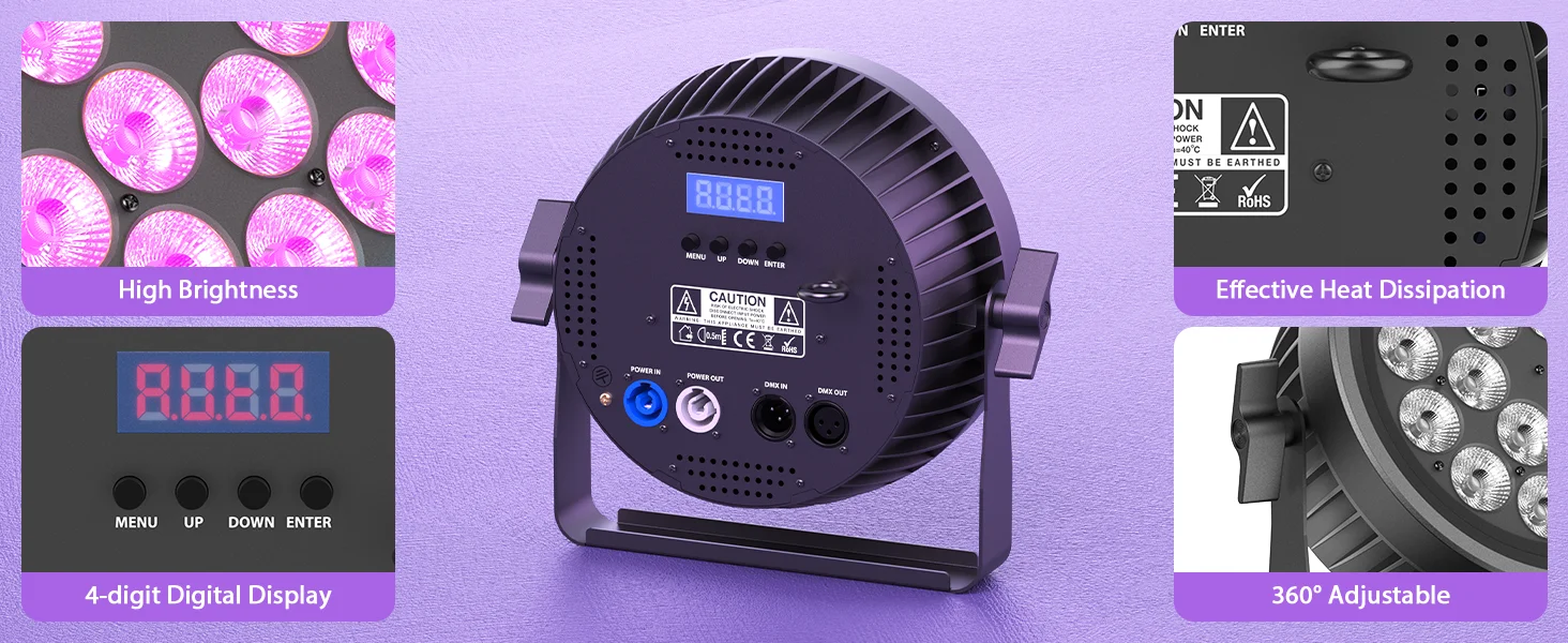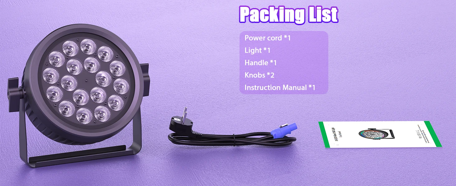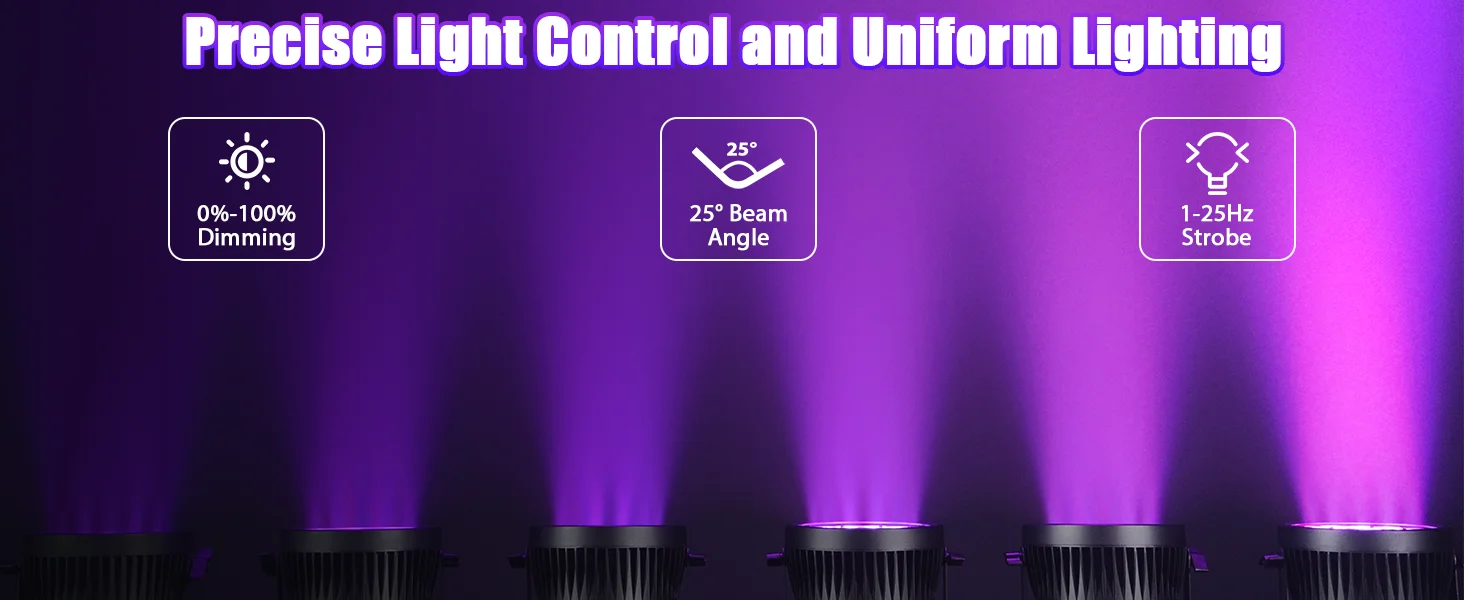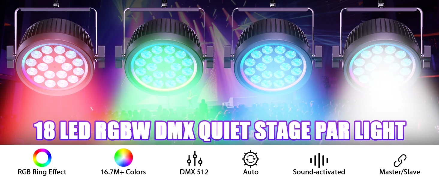 3.Brillo de calidad profesional: Equipado con 18 LED RGBW de 10 W, que ofrecen 34.400 lux a 1 m, más de 90 CRI, 25° Ángulo de haz, 16,7 millones de colores de atenuación lineal y efectos estroboscópicos de 1-25 Hz.