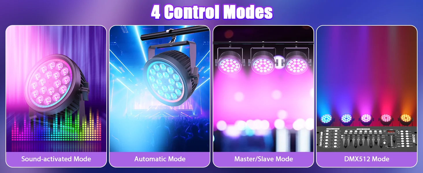4.Control inteligente multiprotocolo: admite DMX512/RDM con modos 7/11/16 canales, sonido activo, maestro/esclavo y automático, perfecto para escenarios, bodas, bares y eventos.