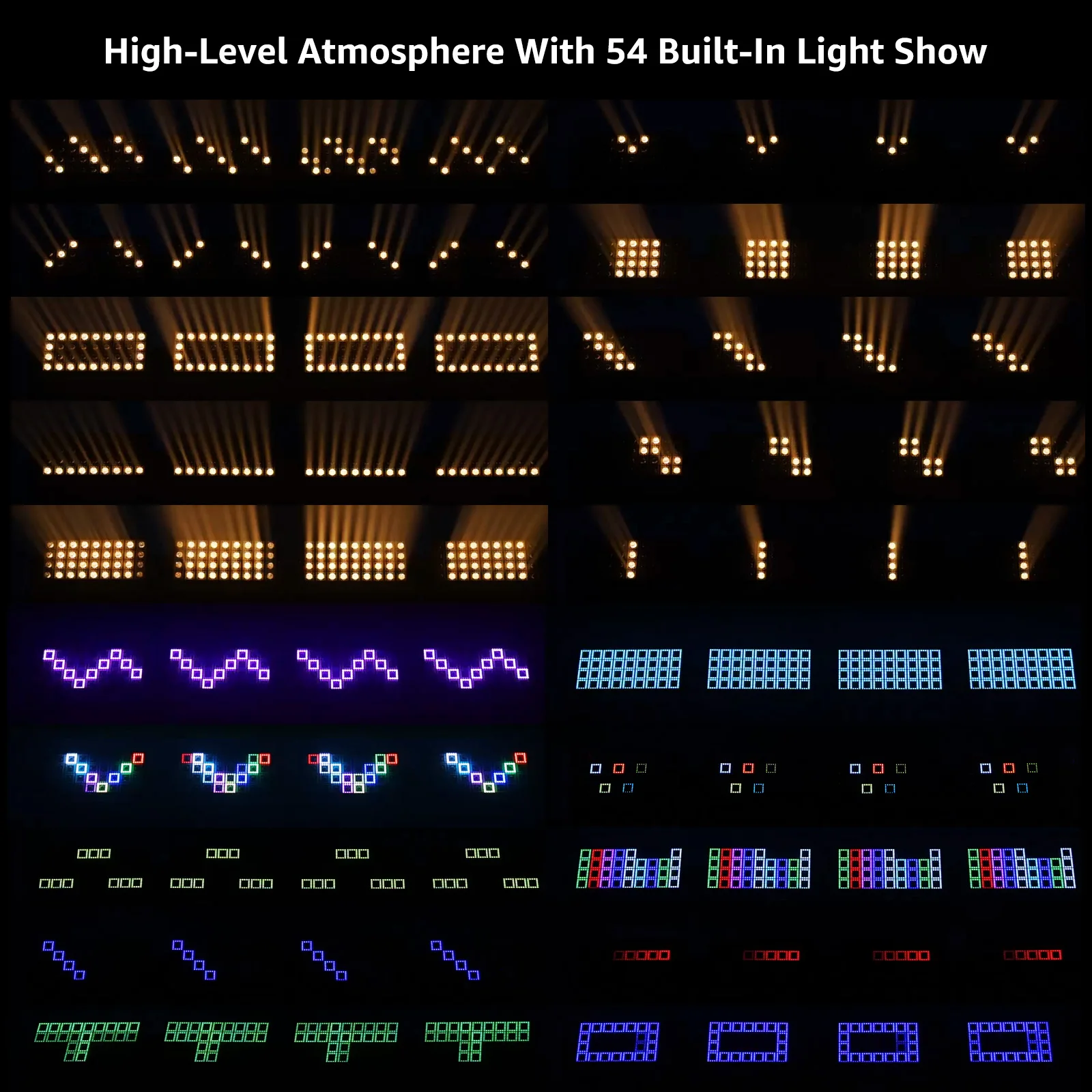 2.【Espectáculo de carrera iluminado integrado en 54】Al alejarse del diseño lineal largo y único, la luz de lavado presenta variaciones de programa integradas que incluyen luz estroboscópica, salto, desvanecimiento, pulso, persecución y más, junto con varios efectos coloridos.