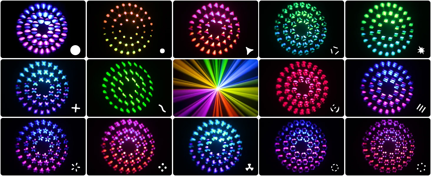 2.[Special optical effects]:Equipped with 48 prims for dynamic honeycomb prism effect and fog effect, capable of creating rainbow effect. The prisms can be positioned and rotated at any angle to achieve precise electronic focusing and enhance the visual effect.