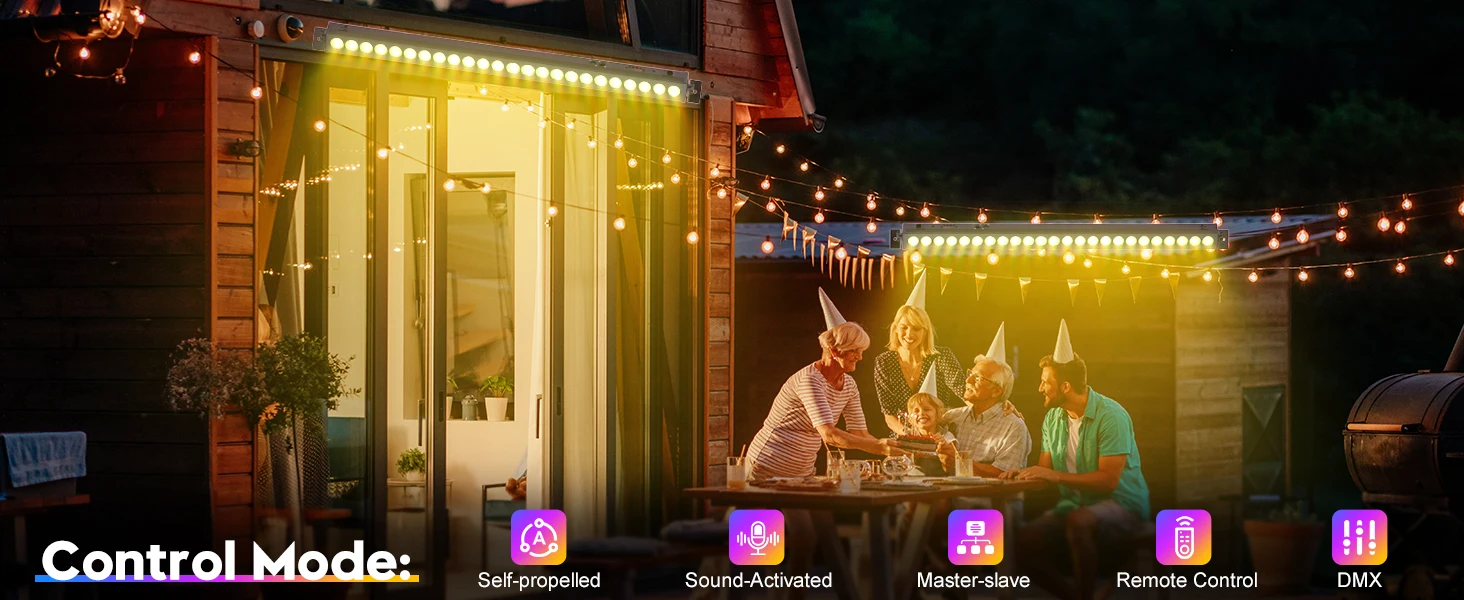 Modo de control: autopropulsado, control de sonido, maestro-esclavo, DMX